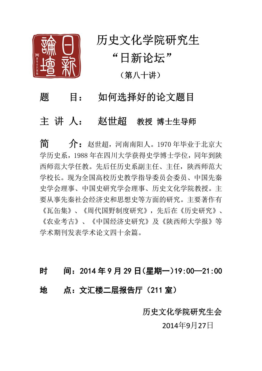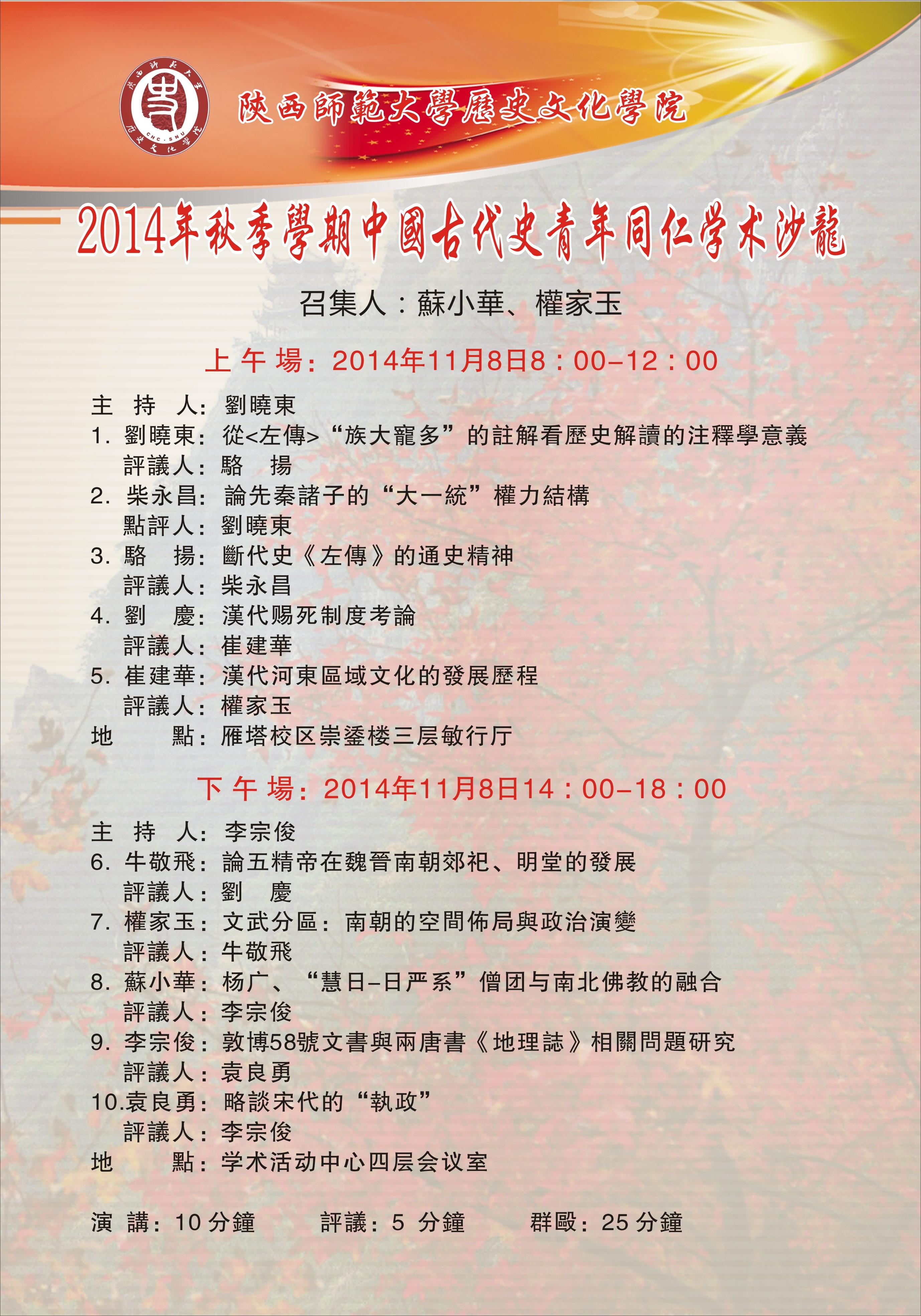 陝西師範大學歷史文化學院 2014年秋季學期中國古代史青年同仁学术沙龍