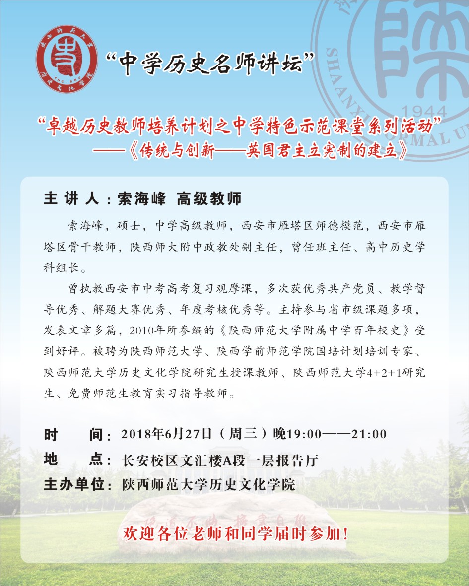 中学历史名师讲坛:卓越历史教师培养计划之中学特色示范课课堂系列活动——《传统与创新——英国君主立宪制的建立》