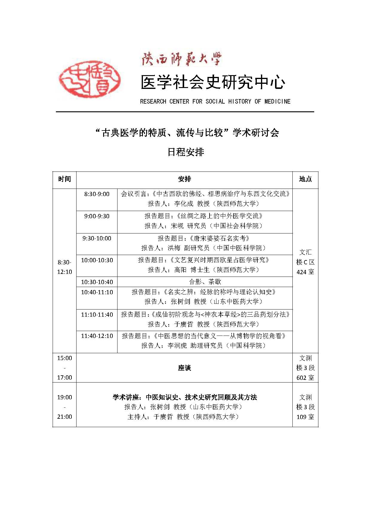 “古典医学的特质、流传与比较”学术研讨会 日程安排