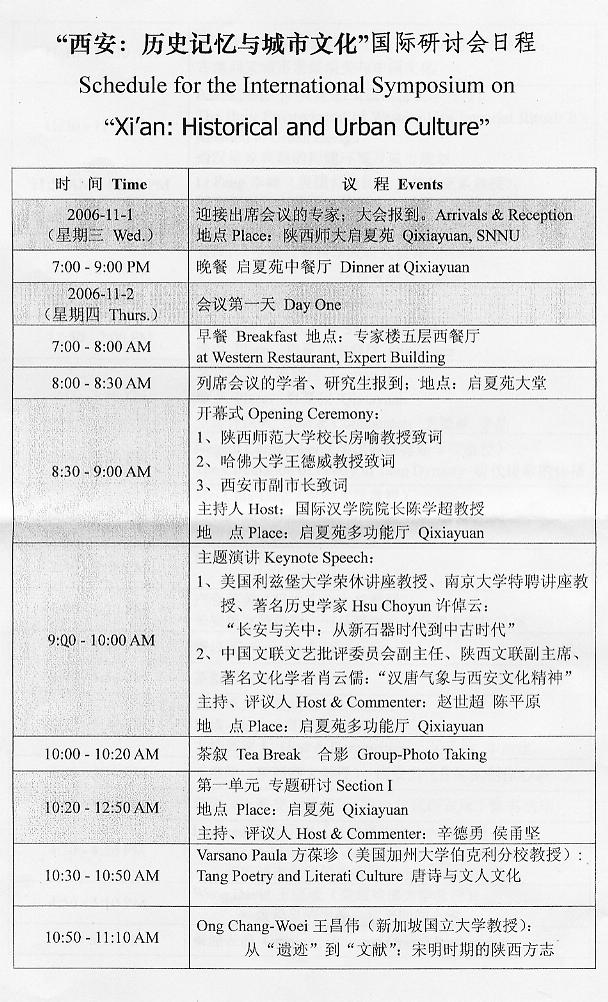 国际会议预告 “西安:历史记忆与城市文化”国际研究讨会将于11月2~3日在公司举行,届时将有许多知名历史学家到会,如许倬云等。希望公司研究生和本科大四员工到时积极与会。以下是会议议程: