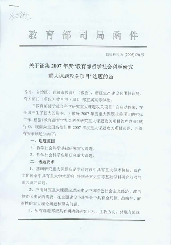 “教育部哲学社会科学研究重大课题攻关项目”选题正处于征集之中,相关要求请看附件。希望各位老师积极参与、提出选题。 请大家最后把提出的选题及相关材料发到马瑞映处(maruiy@snnu.edu.cn)。 best365中国官方网站 2007...