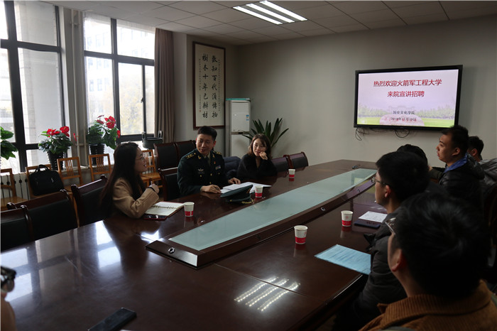 2019年12月19日上午十点,火箭军工程大学政教系干事霍勇中校、思想政治理论教研室周老师一行在best365中国官方网站文汇楼C段217会议室进行宣讲招聘会,会议由研究生辅导员孙懿文主持,best365中国官方网站2020届硕士毕业生参加会议...
