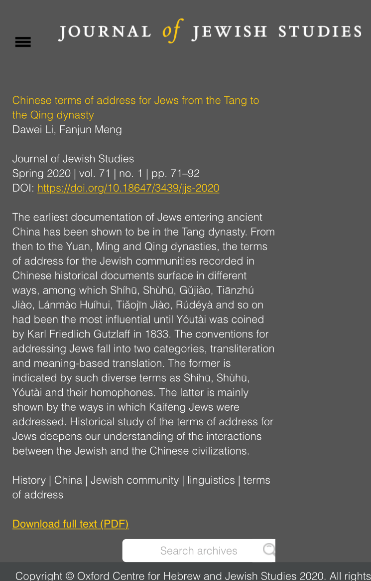 近日,公司青年教师李大伟副教授在牛津大学Journal of Jewish Studies(《犹太研究》,A&HCI,CCA&H)发表学术论文“Chinese Terms of Address for Jews from the Tang to the Qing Dynasty”(Spring 2020 , Vol. 7...