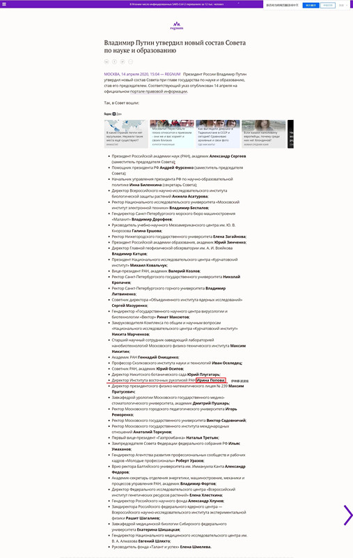据俄罗斯媒体报道,2020年4月14日,俄罗斯联邦总统普京核准通过总统教育科学委员成员名单。公司讲座教授、俄罗斯科公司东方文献研究所所长伊琳娜·波波娃名列其中。 俄罗斯总统教育科学委员会...