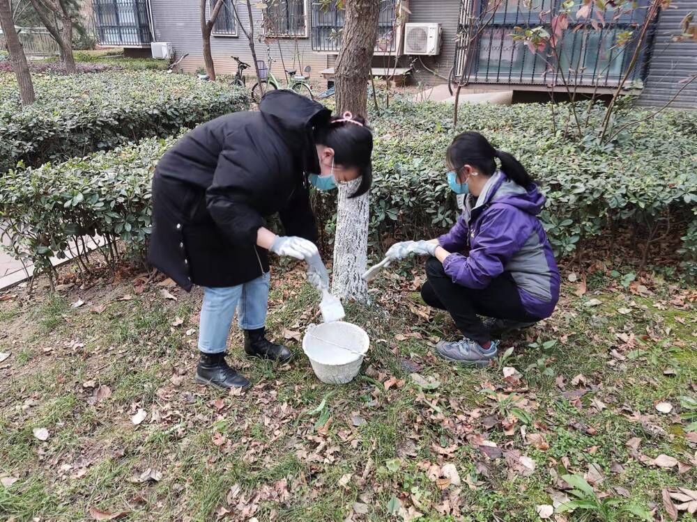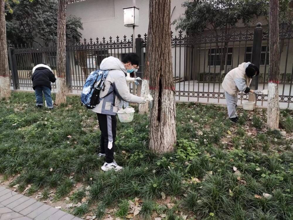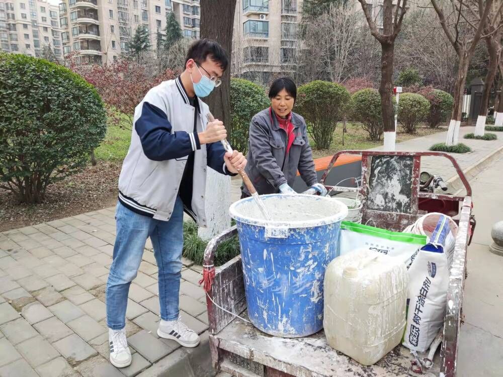 本次“办实事”实践活动的内容是美化家属区生活环境、为树木涂刷石灰水。活动伊始,几位同学首先帮助后勤老师将涂料搅拌到位,接着,劳动人员依次领取劳动工具,划定劳动范围,开始正式作业。本次劳动内容并不复杂,但要求细致认真。参与者们或独立工作,或几人配合,将区域内的树木按要求刷白,并围绕树干仔细检查,将死角或缝隙等地方涂刷完整。随后,在老师与园丁工人的指导下,参与人员又转场多个区域,为家属区内的大批树木完成了涂刷作业。