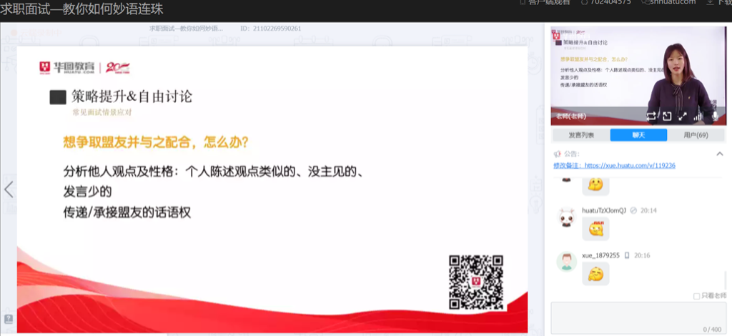 本次培训邀请到了陕西华图教育的李欣悦老师作为主讲,就无领导小组面试技巧、结构化面试技巧、非结构化面试技巧等方面内容分别向同学们进行讲解。李欣悦老师为大家详细介绍了无领导小组讨论的类型、题型、流程、答题策略等,并列举了具体案例,以加深同学们的理解,对于同学们提出的问题也都一一做了详细的解答。
