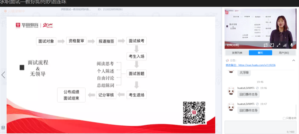 10月24日晚19:00,陕西华图教育的李欣悦老师通过线上教学的形式,就无领导小组讨论面试技巧,结构化面试技巧等方面的内容向同学们进行了分享,通过讲座,同学们学习了实际应用的面试技巧,表达能力也得到了进一步的锻炼。