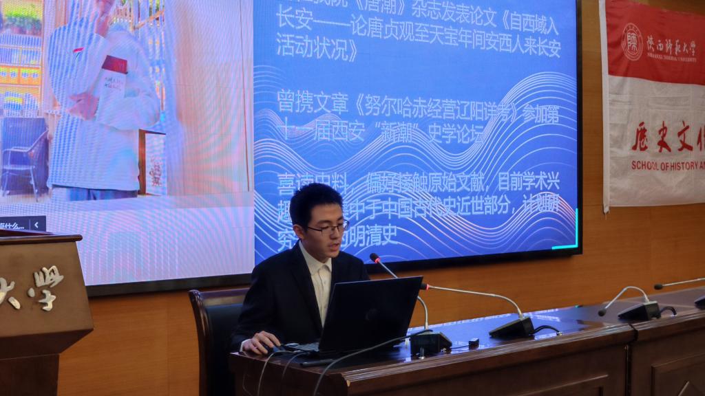 保研至南京大学中国古代史专业的金鹏辉随后向同学们分享自己中国古代史学习的一些心得。他以治史的四把钥匙为引,向大家分享了关于历史学习进阶和练笔的方式。他建议同学们尝试提前确定自己的研究方向并对意向的专业进行重点学习,同时关注面试老师重视的方向。