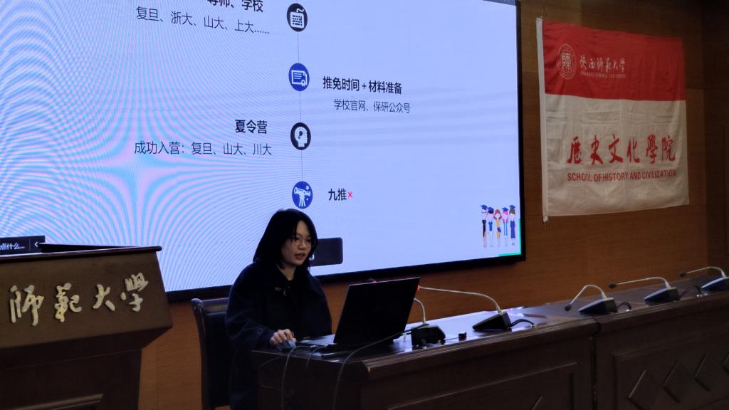 接下来,2018级文物与博物馆学班的朱晓欣向同学们分享了自己的保研经验。她向大家分享了自己为达到保研目标而付出努力的经历,强调丰富的实习经验和广阔的阅读面的重要性,并在最后向同学们推荐了一些适合在学习中查阅的网站平台。