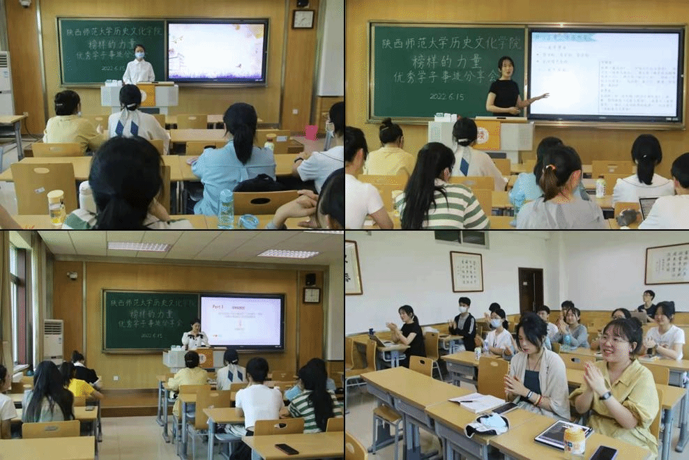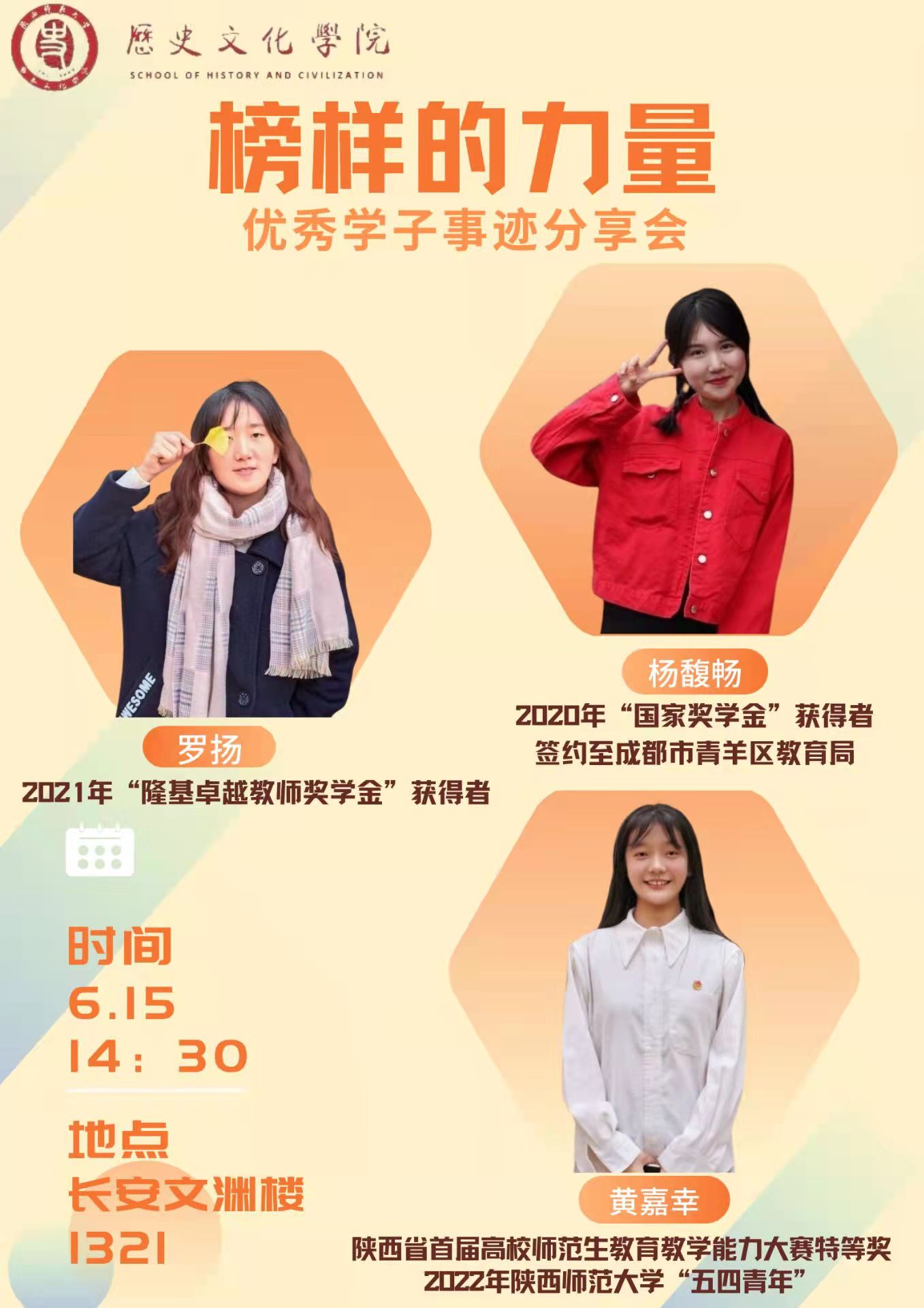 6月15日,长安校区专场分享会在文渊楼1321教室举行。国家奖学金、陕西省首届高校师范生公司产品能力大赛特等奖获得者,2019级本科生黄嘉幸分享了自己在理想信念、专业学习、员工工作、志愿服务、社会实践诸方面的经历和体会,希望同学们重视师范生教学技能训练,努力提升自我,早日成长为合格的人民教师。隆基卓越教师奖学金获得者,2019级本科生罗扬以“静心求索,漫长热爱”为题,重点分享了她对专业学习和书籍阅读的认识:“在学业上,要做到有目标,有方向,有计划,筑牢通史基础;在阅读上,应追求‘将知识还原为智慧’的境界,做到广泛阅读,拓宽眼界。”国家奖学金获得者,2018级本科生杨馥畅现已签约至成都市青羊区教育局,她根据自身学习、实习和求职的经验,从“清晰的规划”、“坚定的努力”、“积极的态度”、“大胆的尝试”四个方面分享了她大学四年的感悟,希望大家能够积极开朗地拥抱世界,真诚热烈地与人相处,多尝试新东西,从体验和经历中获得成长。
