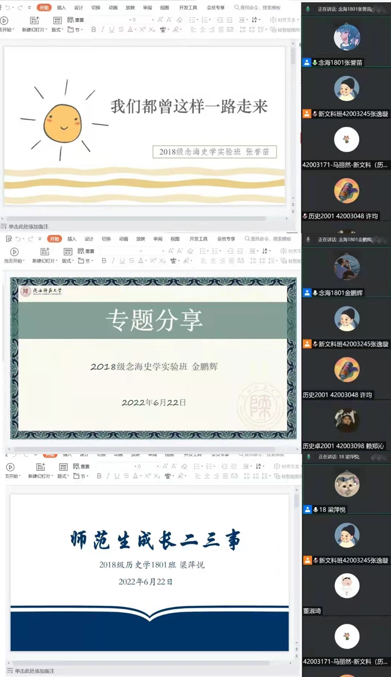 6月22日,云端专场分享会通过腾讯会议在线上举行。国家励志奖学金获得者,硕士研究生推免至复旦大学的2018级本科生张誉苗以“我们都曾这样一路走来”为主题,从“如何认识自己、明确成长目标”,“如何有效学习、实现自我提升”,“如何勇于尝试、敢于抓住机会”,“如何参与实践,促进全面发展”四个方面总结了自己的经验。光正教育奖学金获得者,2018级本科生金鹏辉现已推免至南京大学攻读硕士研究生,他结合个人学术探索经历,重点分享了在中国古代史研究方面的学术经验,鼓励大家借助《唐潮》《杏园》等员工刊物进行学术入门实践,注重并掌握基本的学术论文规范。国家奖学金获得者,现已签约至兰州市第九中学的2018级本科生梁萍悦分享了身为公费师范生的“成长二三事”,并为同学们今后的职业生涯规划提出建议:一是广泛积累资料,形成资源数据库;二是筑牢史学基础,提升学科素养;三是贯通师范专业知识,提升教学实践技能;四是探索个人教学风格,塑造教师人格魅力。