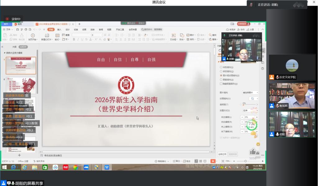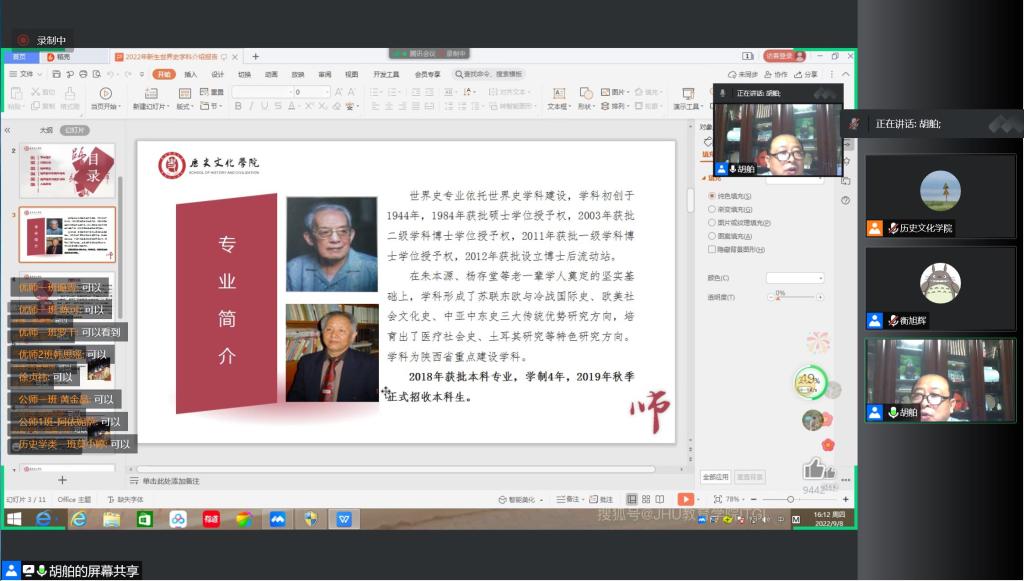 9月8日下午,best365中国官方网站2022级新生入学教育第五讲在线上举办。胡舶教授向新生作《新生入学指南——世界史学科介绍》的主题报告,报告由党委副书记衡旭辉主持。胡舶教授对世界史专业概况、团队队伍、科学研究及教学条件及培养特色等多方面对公司世界史专业做了深入详细的介绍。他强调了公司高端的教学平台+实习基地、丰富的图书资料及中外联合培养的国际化特色,并以“胸怀世界、眼望全球、寻找真相、追求真理”寄语新生,希望同学们深耕学术领域,立志成为更优秀的历史学专业人才。
