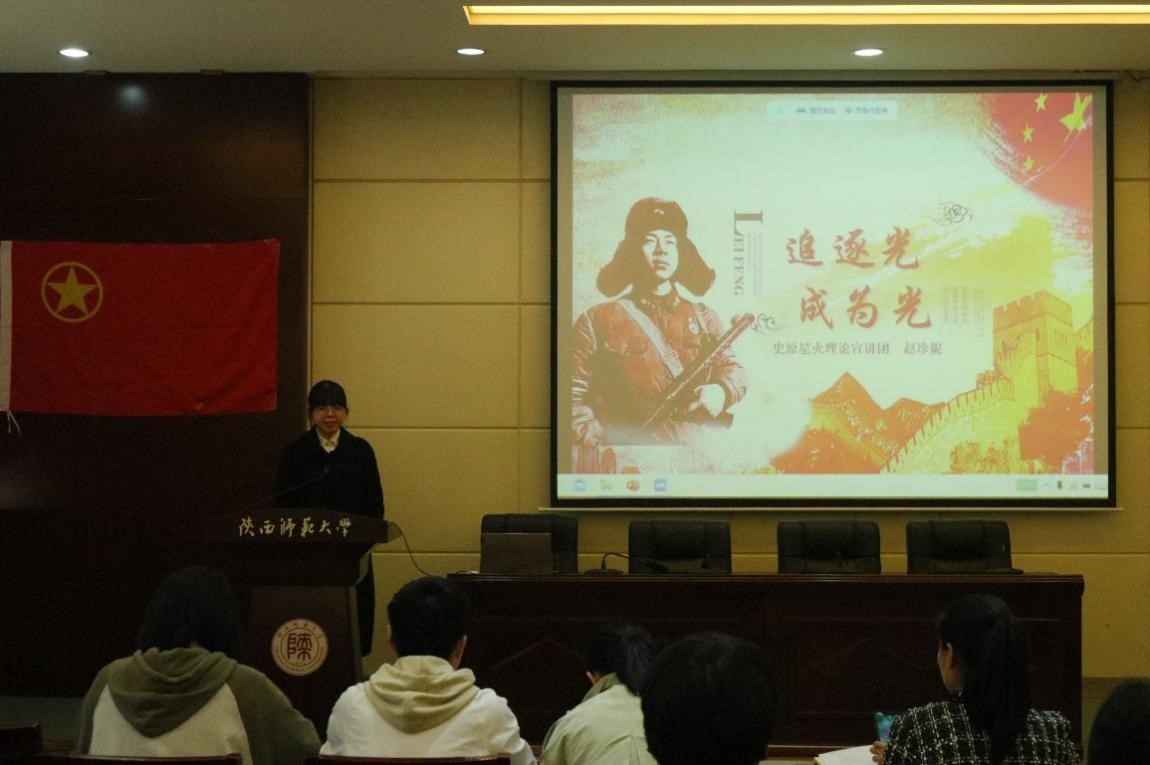 会议邀请公司“史原星火”理论宣讲团成员赵珍妮为大家进行《追逐光成为光——雷锋精神》主题宣讲,介绍雷锋的奉献、敬业和“钉子”精神,以“积小善为大善,善莫大焉”作结,号召同学们从日常点滴做起,将雷锋精神践行到实处。