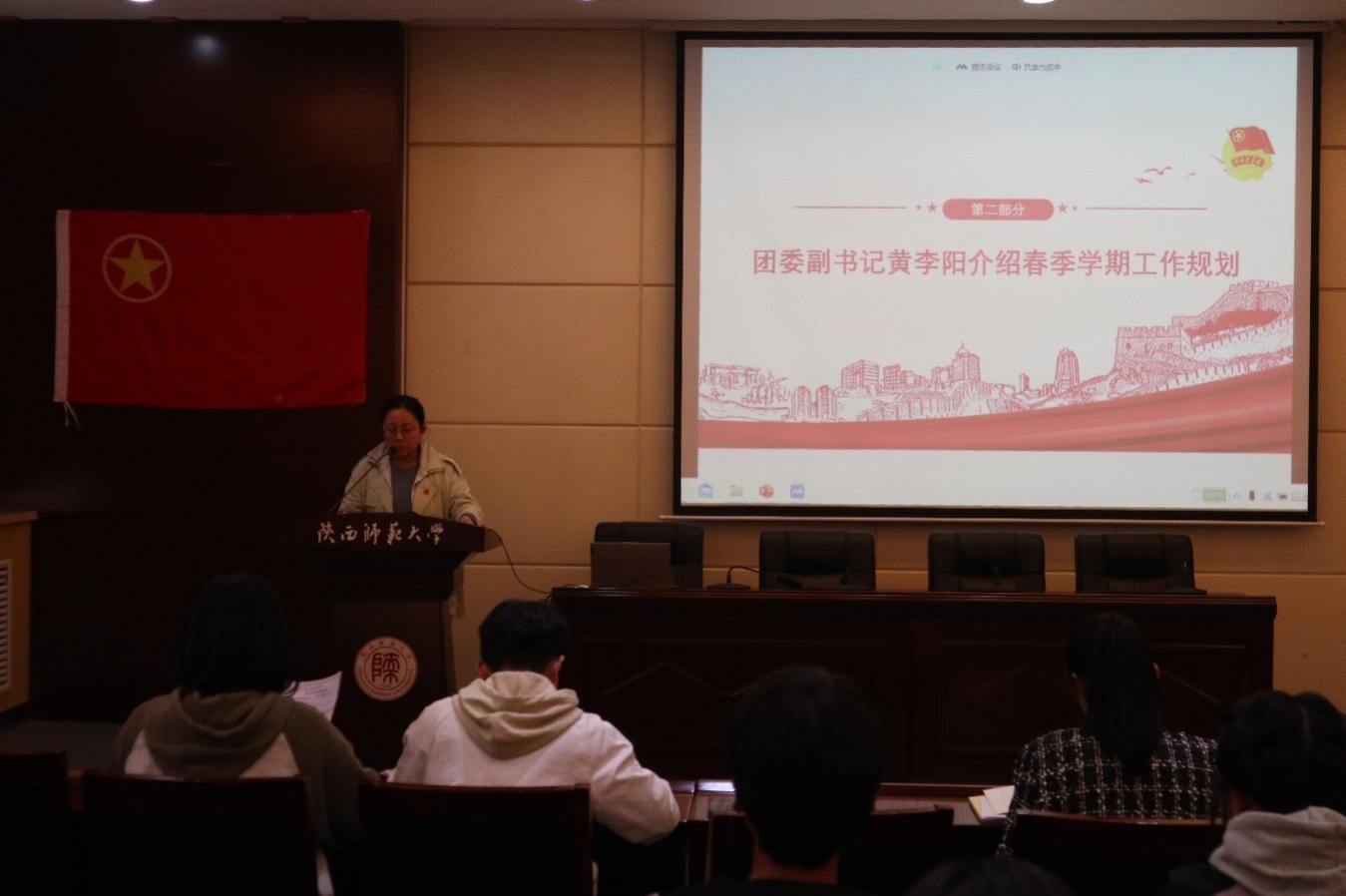 团委副书记黄李阳介绍了春季学期工作整体规划,强调青年大学习、主题团日活动等日常团学活动的规范开展,并对后续重要工作进行讲解。
