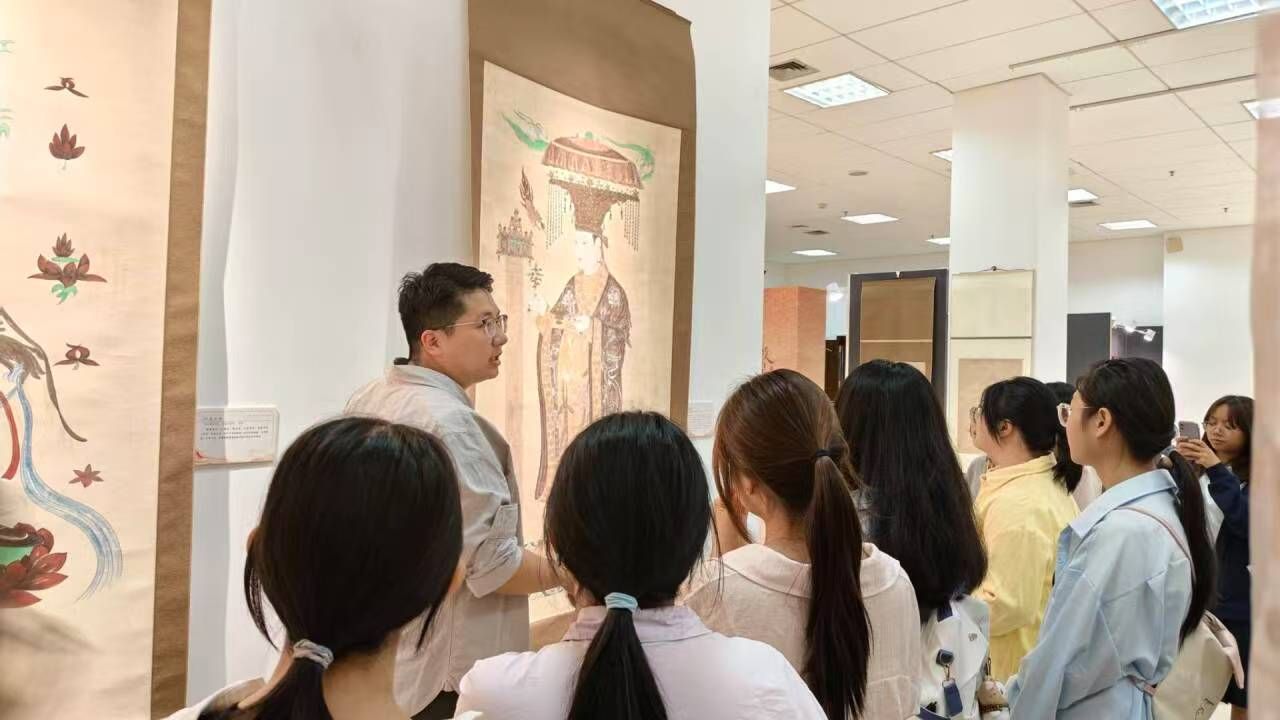 5月14日,2024级历史学(优师计划)班团支部开展“探寻古画匠心,传承劳动精神”主题团日活动。团支部成员走进图书馆敦煌壁画展厅,于千年壁画中探寻劳动指挥的密码。讲解员以“劳动”为主线,带领同学们穿越时空,感悟劳动者的奋斗与匠心。古代画工以画笔为尺丈量文明厚度,新时代青年学子更当以实干为舟远航未来征途,扬起劳动精神的风帆,在传承与创新的浪潮中勇担时代使命。