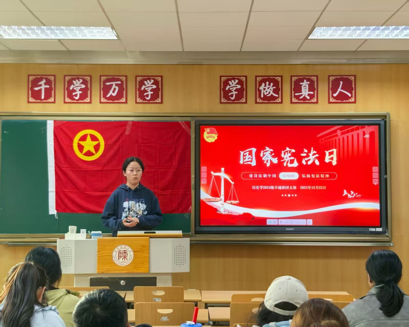 2025年12月23日,2024级历史学卓越教师实验班团支部开展“学习贯彻习近平法治思想,以青春之姿护航法治中国”主题团日活动。团支部书记郭彧忱聚焦国家宪法日的时代召唤与青年使命,带领支部成员深入学习习近平法治思想在全面依法治国中的重要作用,并组织支部团员共同讨论习近平法治思想中“十二个坚持”的核心要义,探索青年法治责任。活动还设置“青春誓言”环节,支部成员共同承诺将以习近平法治思想为指引,将学习宪法当做自身全面发展的“必修课”。本次团日活动切实增强了支部团员青年的法治素养与责任担当,推动宪法精神和法治思想深入人心。