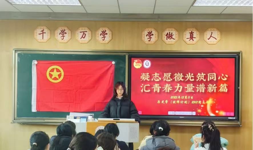 2025年12月11日,2025级历史学(优师计划)班团支部开展“凝志愿微光筑同心,汇青春力量谱新篇”主题团日活动。团支部书记李诗佳结合习近平总书记致中国志愿服务联合会第三届会员代表大会的贺信,系统阐述新时代志愿服务的价值,并设置“志愿关键词”互动环节巩固学习成果。此外,支部特邀“史原星火”宣讲团,以乡村振“新”为主题,讲述志愿者如何以“创新”理念推动乡村振兴发展。本次团日活动既有理论深度,又具实践观照,激励支部成员积极投身社会实践,以志愿服务践行青年使命。
