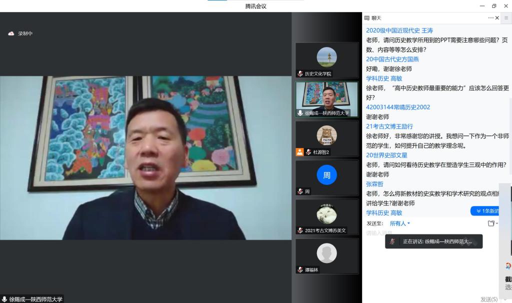 紧接着,徐赐成教授做题为《历史教学理念的表达与实践落实》的讲座,讲座内容分为四个方面:一、从多样性、凭借性、习得性、发展性来说明历史教学技能特性;二、以历史课程的教育功能、指导史观、学科核心素养等方面阐释历史教学基本理念;三、结合自身经历,传授历史教学技能及历史教学经验;四、运用时空观念,史料实证,以唯物史观进行历史解释来充分体现家国情怀的逻辑来论述对历史核心素养的理解。