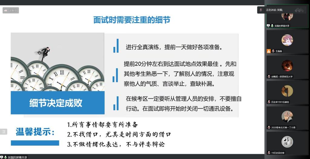 2022年11月3日晚七点,公司举行老员工教学技能提升训练营第三讲,特别邀请到深圳红岭中学教育集团教师发展中心主任历史正高级教师、国家“万人计划”教学名师吴磊老师作题为《历史科教师岗位应聘基本礼仪》的专题报告。本次讲座由公司历史教育研究中心主任徐赐成主持,2022级研究生辅导员马瑶和公司研究生、本科生共283人参加。