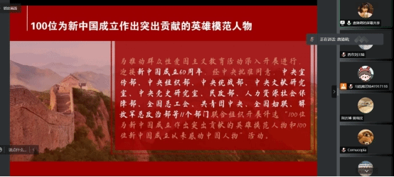 活动以“一百位英雄”、“一份遗书”、“一封家书”三个板块展开。在“一百位英雄”部分,我们一同回顾了一百位为新中国做出突出贡献的英雄模范人物的事迹,体会革命精神在不同时期的具体展现;在“一封遗书”部分,团员们一同朗诵了江姐的遗书,感悟江姐在草纸碳墨上书写它们时的必胜决心;在“一封家书”部分,大家一同朗读了地下工作者李白牺牲前的嘱托,观看了北京邮电大学原创舞台剧《寻找李白》的片段,以此缅怀先烈、铭记来路。活动最后,团员们一同观看了混剪短片《一百年华,归来的你依然青春》,从自身实际发表了个人感想,更加坚定了努力为实现中国梦步伐不动摇的信念。