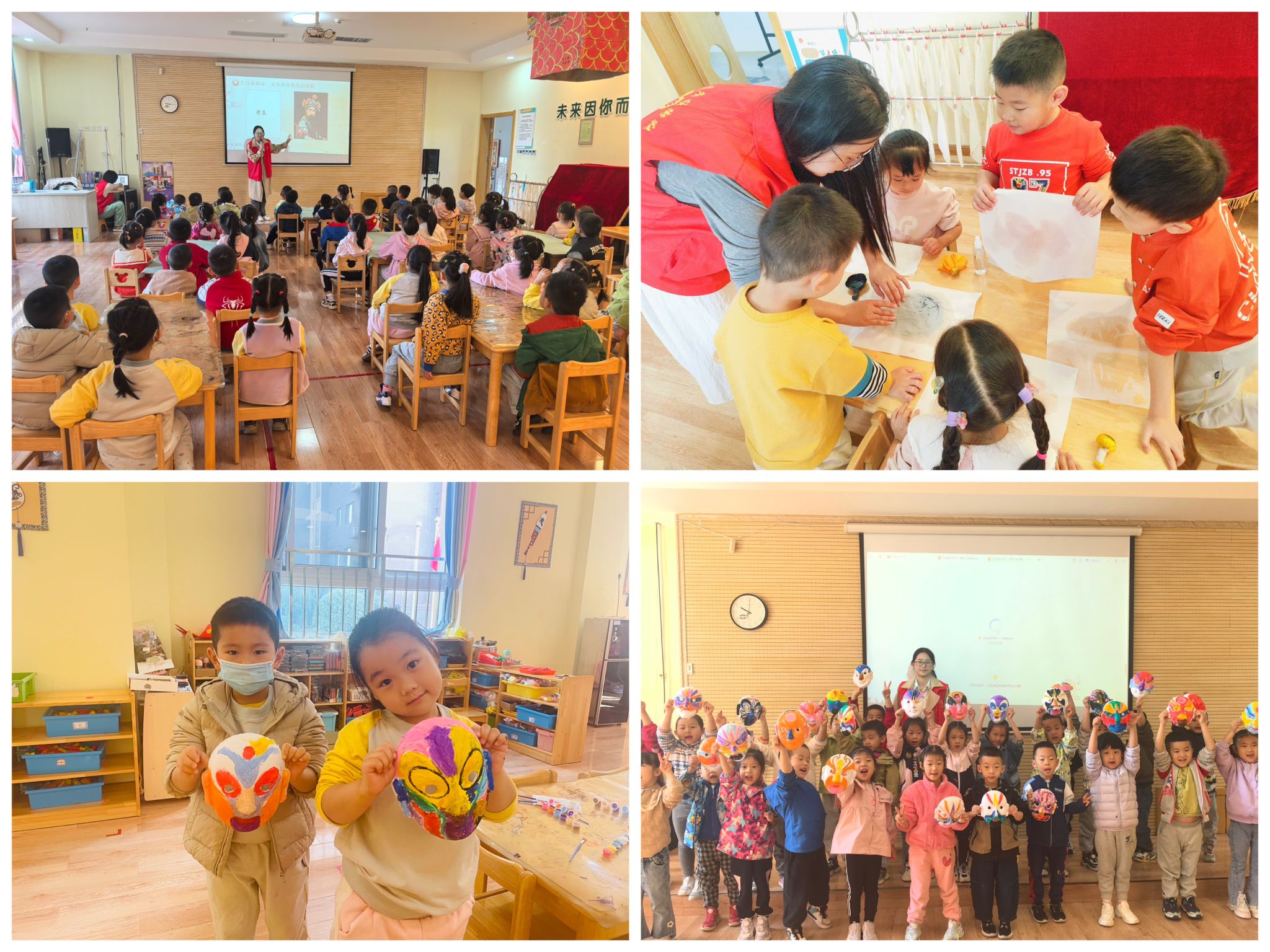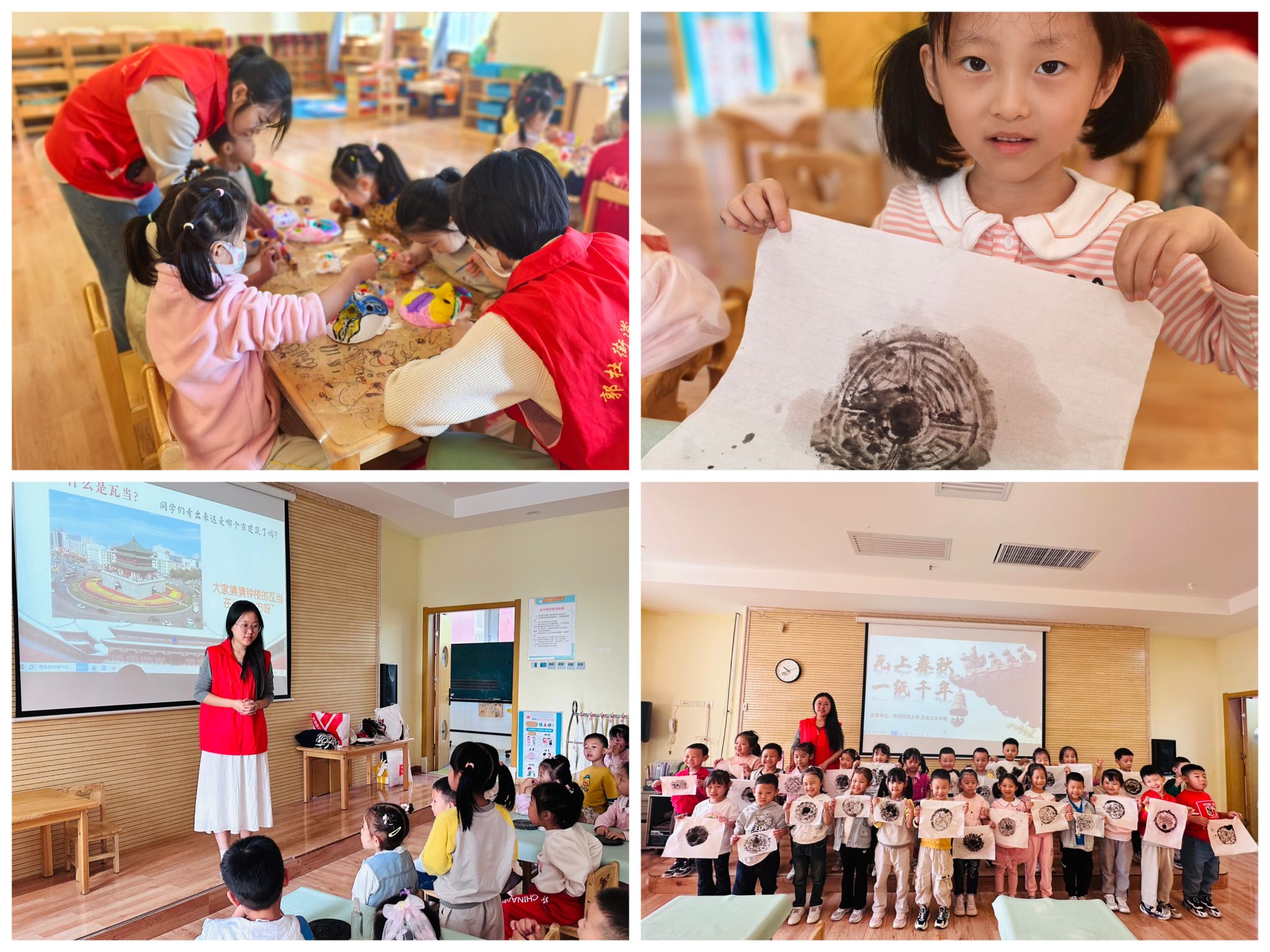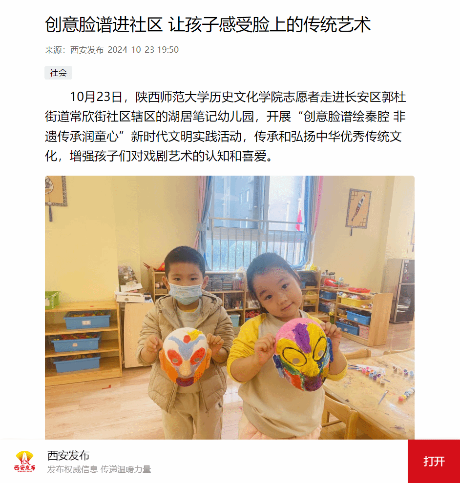 2024年10月,宣讲团带着小小瓦当和一张张面具脸谱又走进了西安市长安区郭杜街道常欣街社区,和社区的工作人员一起给雅居乐湖居笔记幼儿园的小朋友们带来生动有趣的实践课。