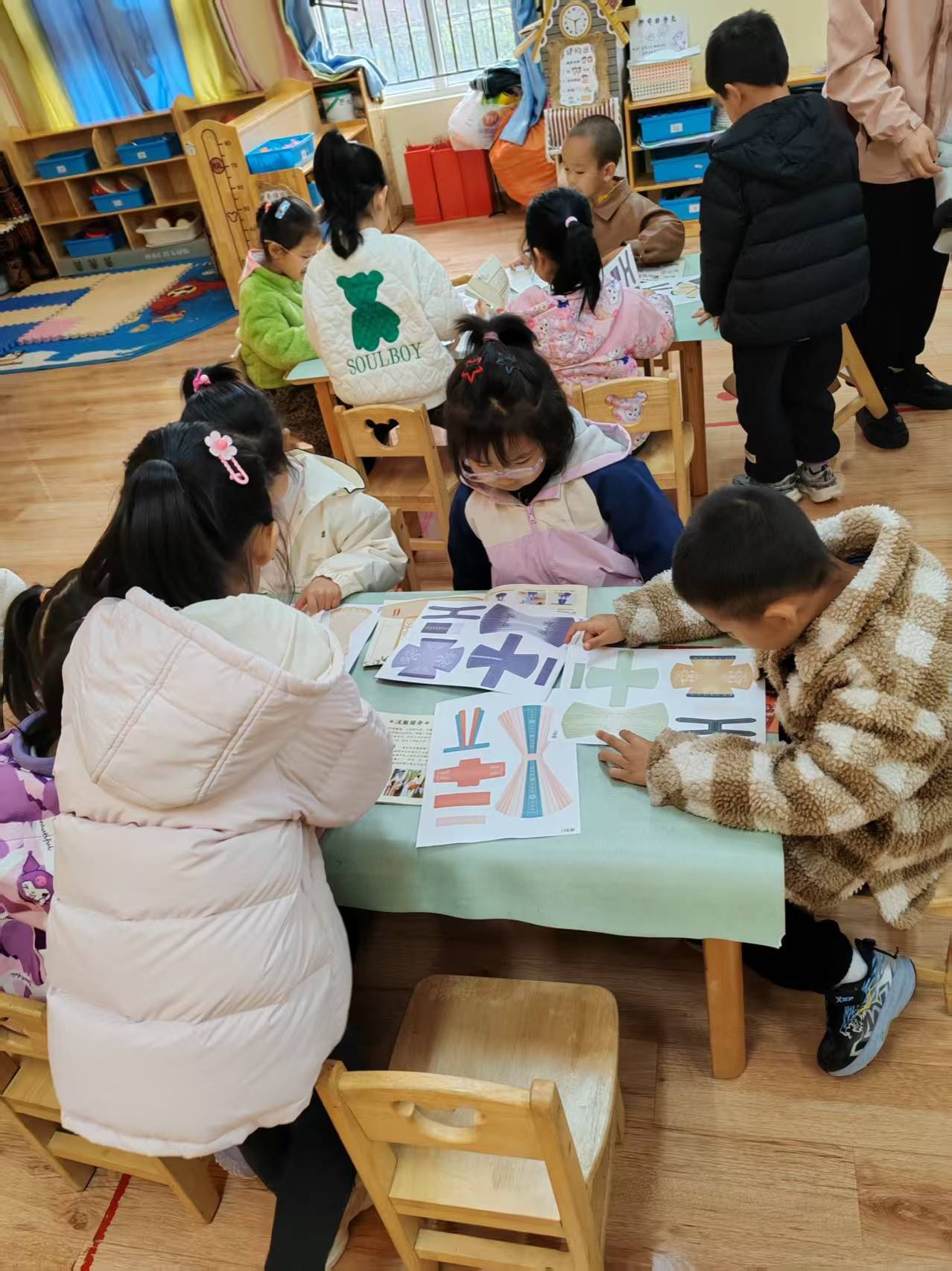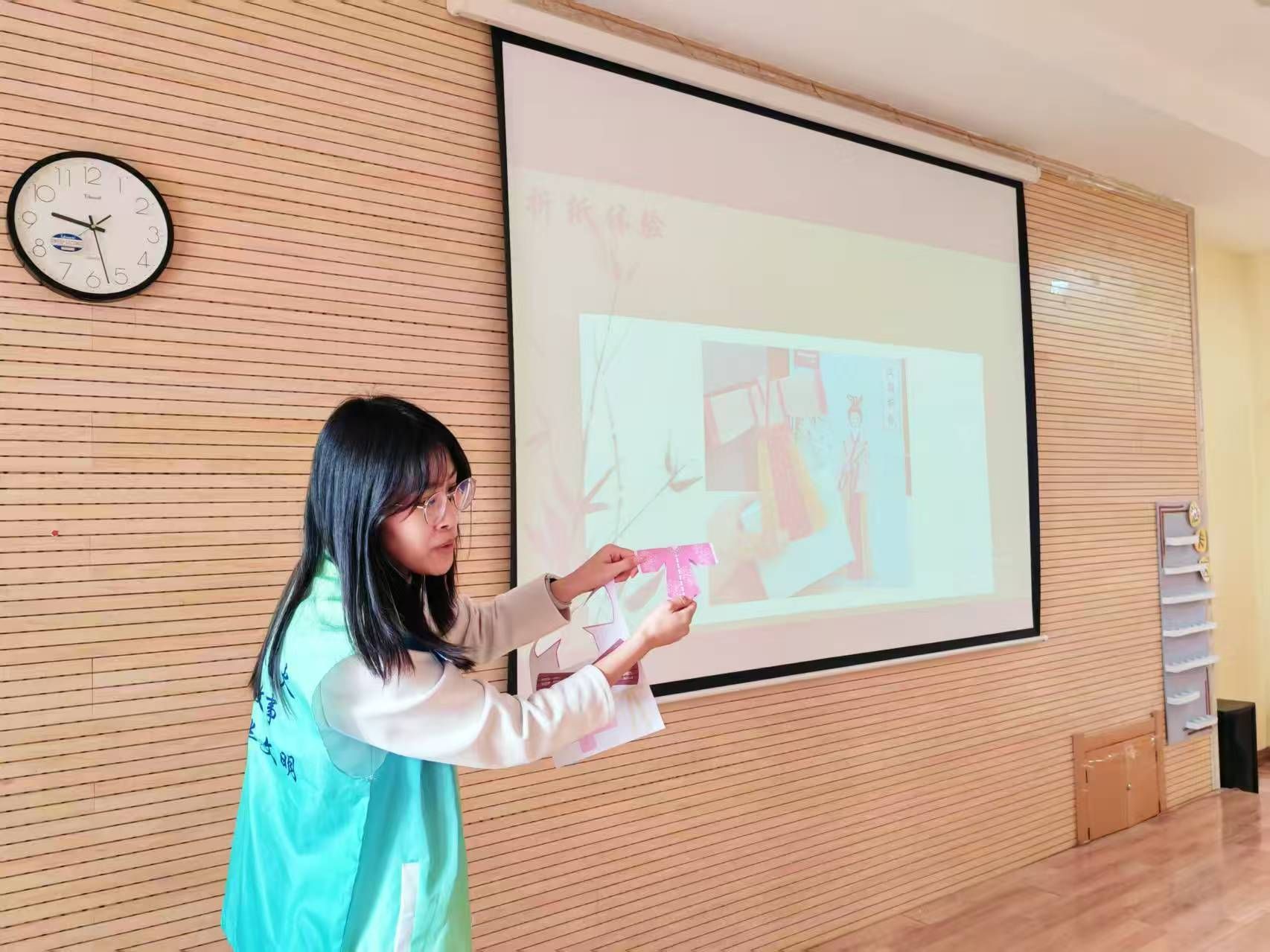 在核心的折纸体验环节,孩子们拿起彩纸,在讲师与志愿者的指导下,跟着台上的演示一步步折叠、造型。大家以6人为一组,互相协作、彼此帮忙,一张张彩纸在稚嫩的指尖化作精巧的纸艺汉服,既还原了交领、宽袖等经典形制,又融入了自己的创意巧思,一件件独一无二的“迷你汉服”在课堂上诞生。