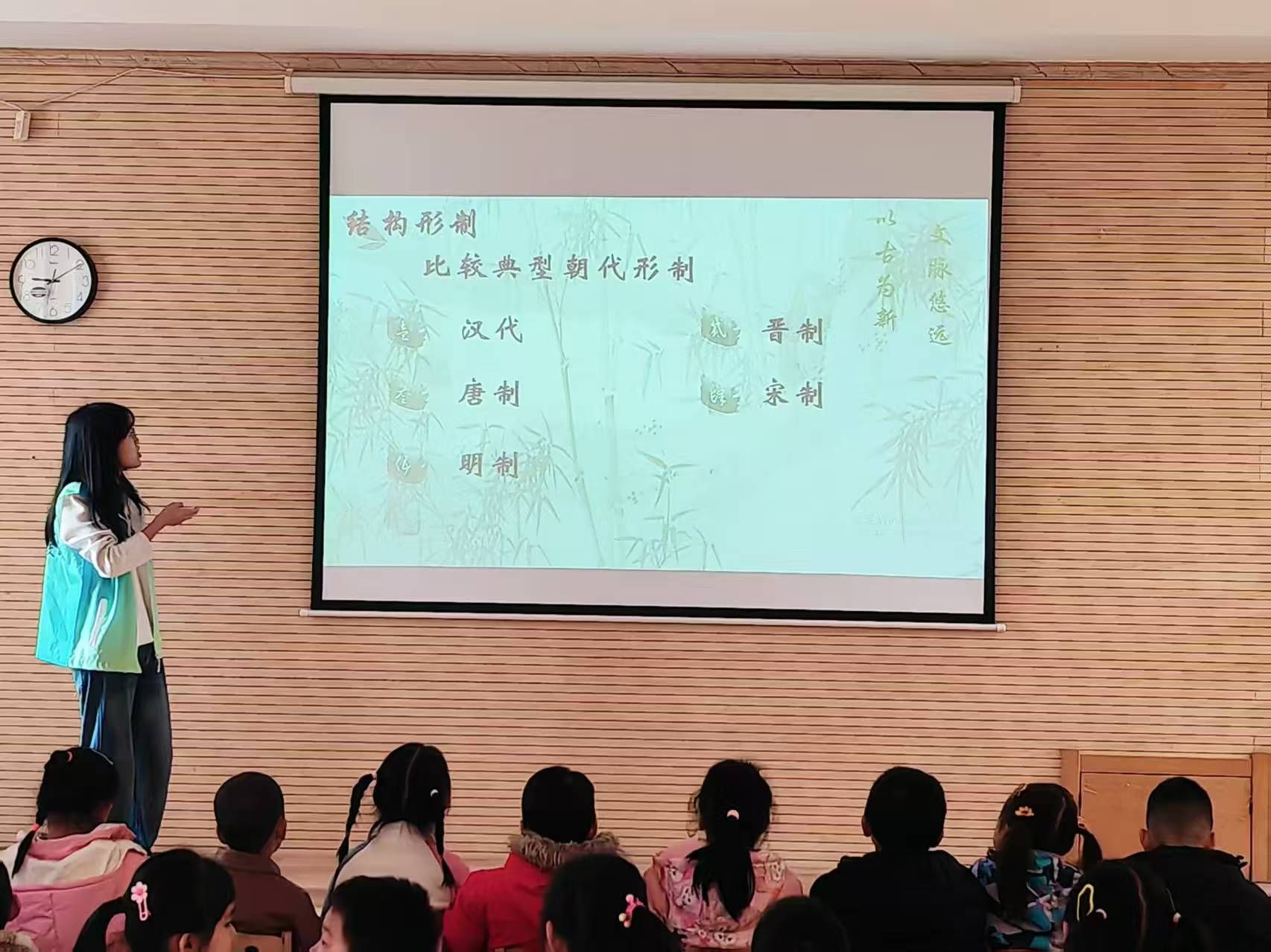 活动现场,李碧涵讲师站在屏幕前,以古今穿衣风格对比为切入点,用生动易懂的语言为孩子们讲述汉服的历史渊源与基本结构形制,重点讲解各朝代汉服的特色与演变,随后又分享了汉服在现代的复兴故事。小朋友们坐得笔直,专注听讲,积极举手互动,课堂氛围活跃有序。