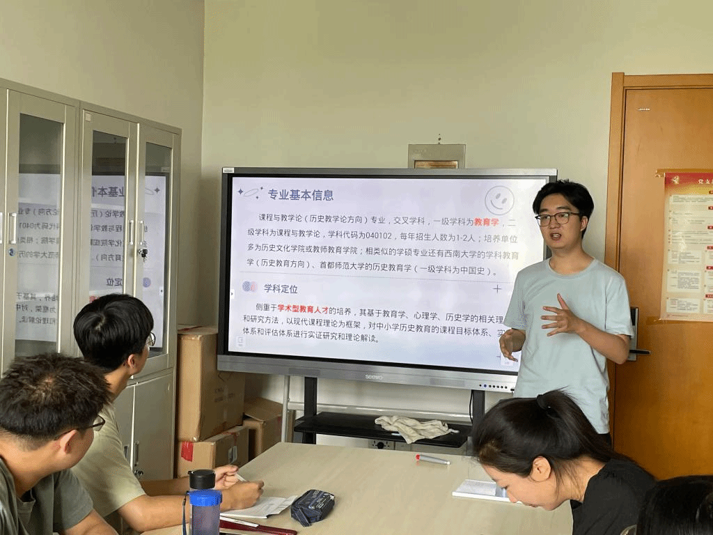 李子鑫学长同样结合自身专业,从专业基本分析、学科定位等方面进行分享。在专业分析方面,学长讲到,“历史课程与教学论”注重学术性教育人才的培养。因此未来选择大致分为两条路,一是继续深造,二是就业。之后学长通过对比各大院校的相关课程设置、团队力量为大家提供了具体的院校选取建议。在备考方面,学长向大家介绍了考试科目、分值设置、题型等内容,为大家提供科学的备考指南。最后李子鑫学长总结道:历史课程与教学论专业更适合有一定教学基础且想从事历史教学研究的同学选择。
