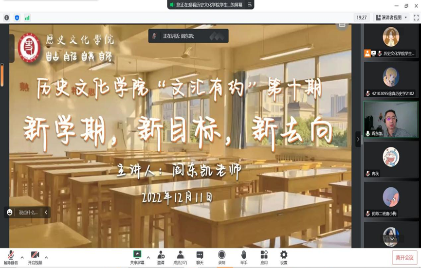 12月11日下午,best365中国官方网站第十期“文汇有约”师生交流活动于线上进行,公司阎东凯老师应邀参会,以《新学期新目标新去向》为主题,与同学们进行交流。共30余名同学线上参会。