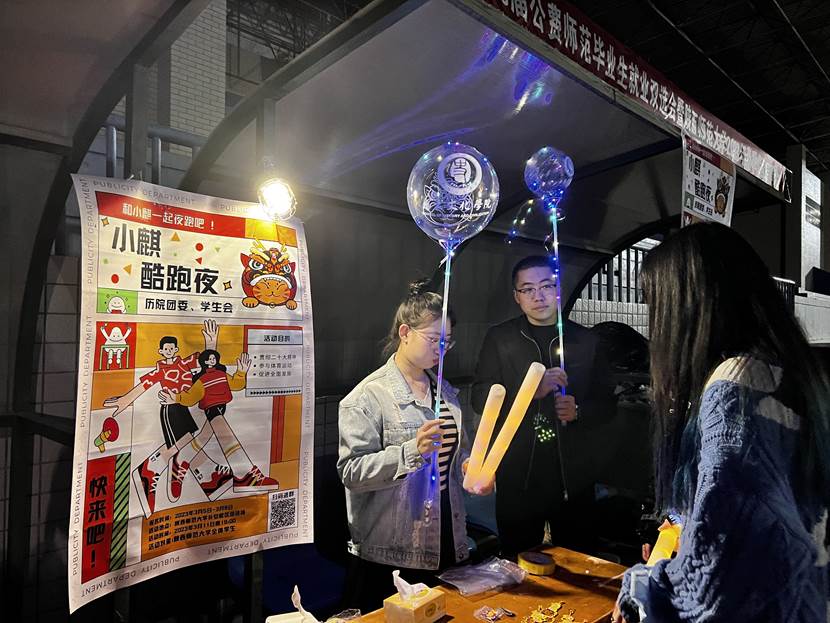 时间渐过,陆续有完成夜跑活动的同学们来到活动起点处,凭借手环和贴纸进行抽奖或兑换奖品。本次活动奖项分别设置有“小麒心动奖”、“小麒助力奖”和参与奖三类。奖品中包含的制作精美的历小麒周边和文创成为了独家特色,吸引了各院同学前来参加活动。其中,“小麒心动”奖得主best365中国官方网站员工白欣妍在采访中感叹:历小麒周边的加入增加了活动吸引力,同时,作为一次面向全体师大同学的夜跑活动,这样的创新通过公司吉祥物向他院同学展示了best365中国官方网站的精神风貌。