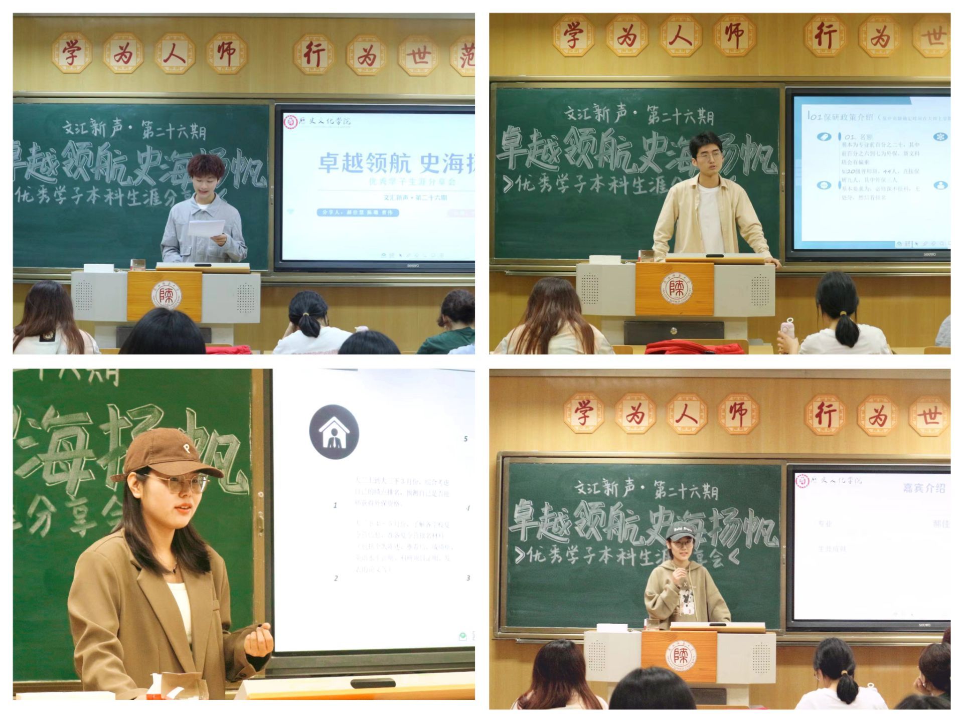 陈璐首先分享了自己的保研经验,介绍了关于保研本校和外校的具体流程,并在英语学习和论文写作等方面给予了实用的建议,告诉同学们不要焦虑,山有顶峰,海有彼岸,一切皆有回甘。郝佳慧分享了考研相关经验,向同学们强调了专业基础的重要性,提醒同学们尽早规划好道路。就本科论文写作提出了在课上积累选题,广泛阅读,看一手史料等切实的建议,并寄语同学们:专精以求有所长,涉猎以求广常识。曹伟进行了保研政策的详细介绍,提及了师范生实习相关问题,并分享了在学习生活中如何应对焦虑的方法。