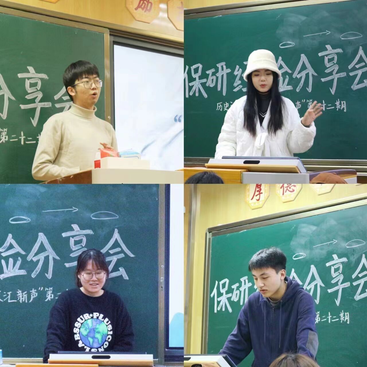 王岩一方面从“经验”的两重含义出发,详细介绍了保研的评选对象、基本条件以及加分项等重要信息。另一方面,结合自己的经历分享了如何正确看待、缓解保研焦虑。周桐桐则围绕夏令营面试经验,全面具体地说明了面试的类型、内容、以及自己在面试备考过程中积累的经验和需要注意的细节,使同学们受益匪浅。赵文婷分享了自己在择校和信息获取方面的经验和方法,并结合自己的保研心路历程,强调了前期准备的重要性和处理情绪的重要意义。车志峰首先针对“预推免”概念,详细说明其流程;其次,立足个人专业,深入浅出地分析了预推免的前景;最后补充了报名、面试各环节的具体情况,为许多同学提供了更加具体的指导和建议。