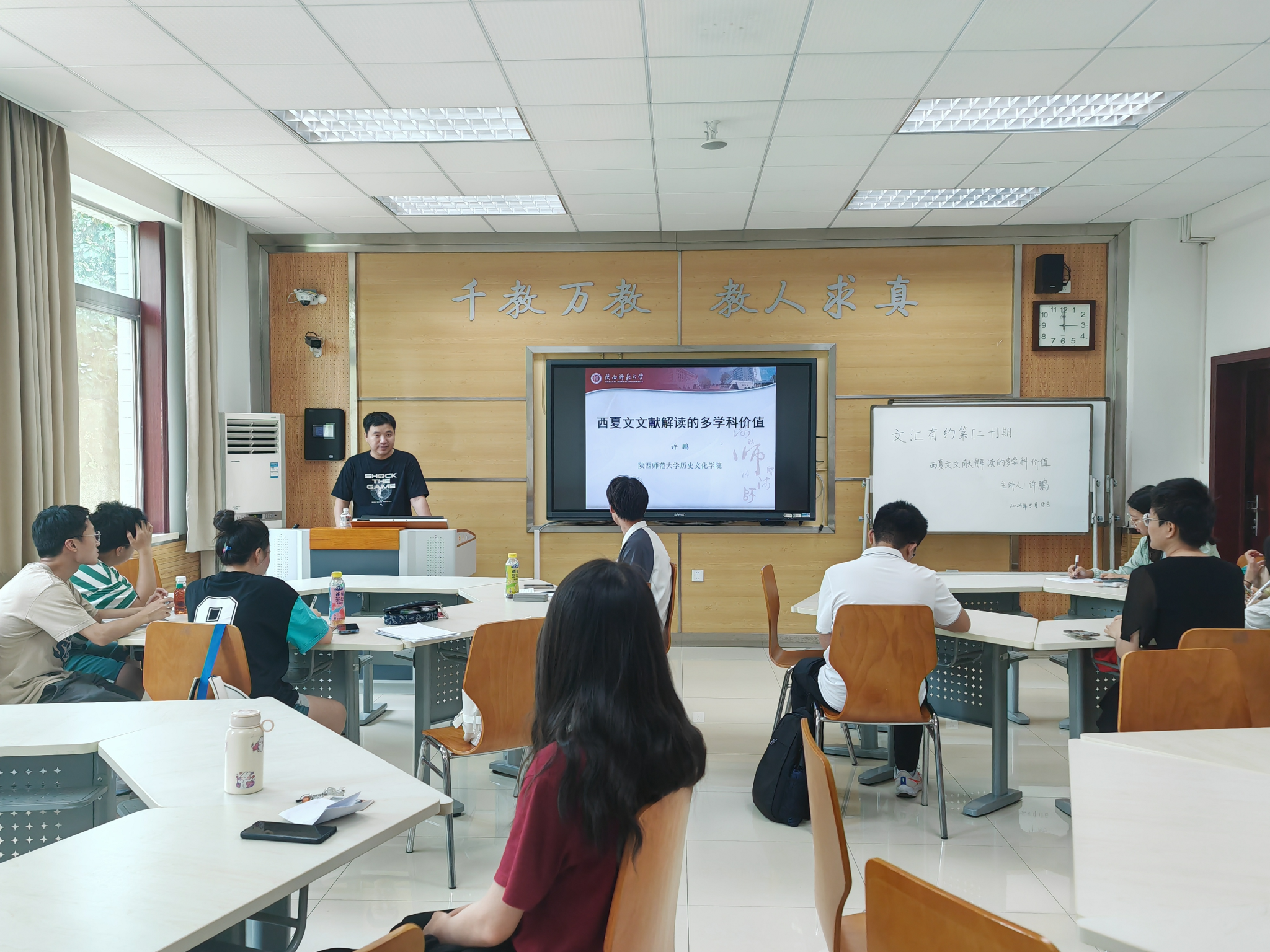 在师生互动环节,同学们积极提问,现场氛围热烈。许鹏耐心解答同学们提出的问题,阐释了西夏文与汉字本质上的异同,提醒同学们可以通过学习有汉文底本的西夏文文献实现对西夏文文献的初步利用。