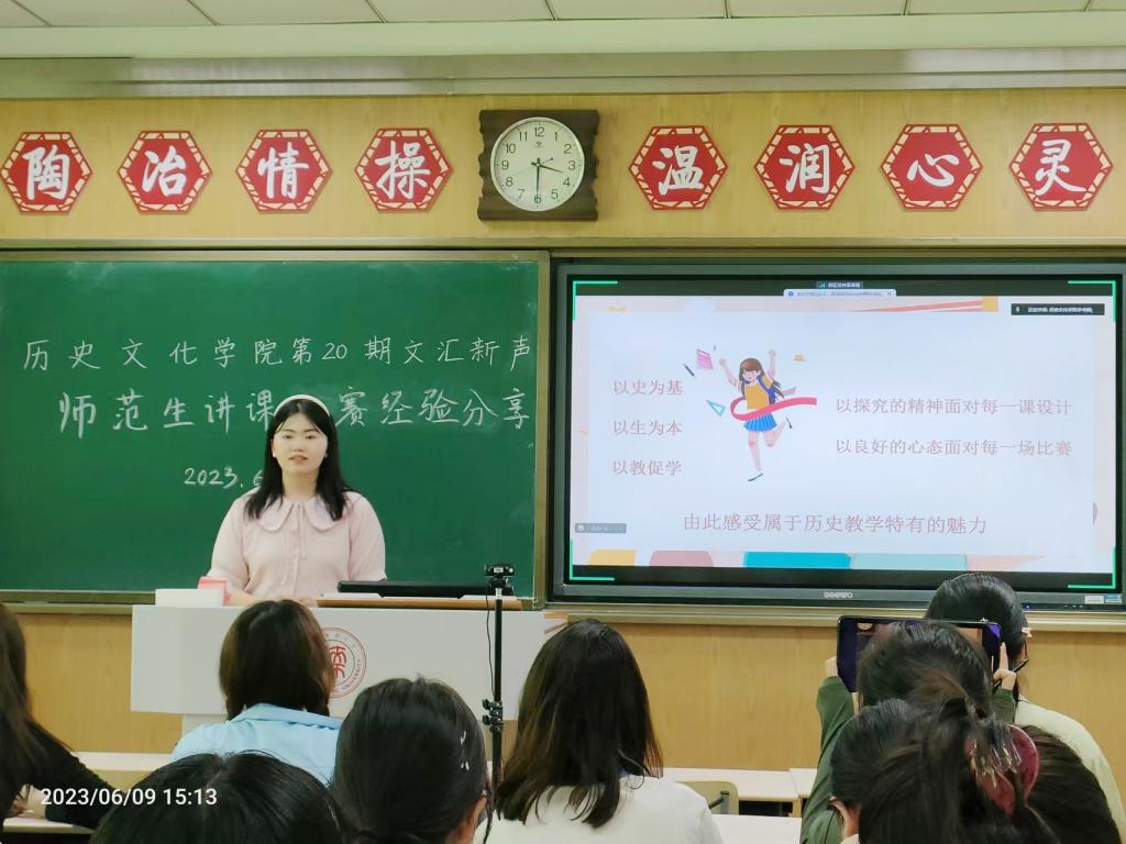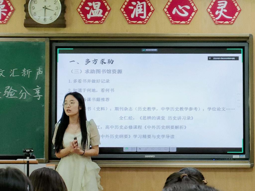 王奕从“多方求助”、“自我探索”、“健康心态”三个方面分享她备课讲课经验,建议同学们扎实专业基础,多看名师课堂,适度模仿,锻炼评课能力,定期与团队进行交流等并推荐辅助备课书籍,强调讲课时要锻炼真实互动的能力,善于运用历史逻辑而非语言逻辑,不能轻视教资教态、板书和语速语调,勤于思考,发散思维。最后王奕鼓励同学们“自信、自谦、自我突破”,摆正师范生心态、同学心态、比赛心态,以赛促练,“纵学海无涯,进一步有一步的欢喜”。