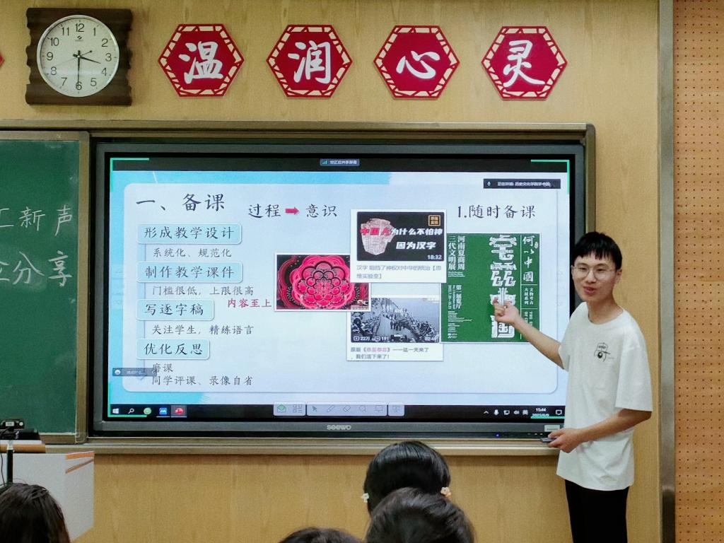 王哲文分享了备课的思路与心得,通过自身课例,强调备课应当要理解课标、整理课本、明确主题与重难点;在处理教学环节时要“想衔接、想引导、想问题、想效果”,形成系统化和规范化的教学设计;制作课件时应注意“内容至上”,发挥其工具性和特色性;逐字稿要精炼语言、问题导向、关注员工;最后可以通过同学评课、录像自省、反复磨课等方式进行优化反思。王哲文还建议要养成随时备课的意识,多听多记,建立素材库,与志同道合的伙伴一同进步。