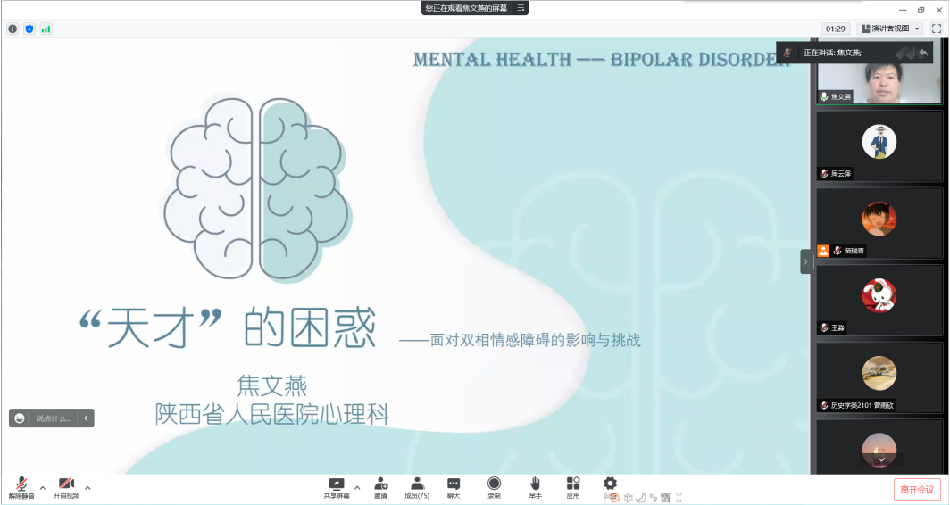 此次讲座采用线上腾讯会议的方式进行,主讲人将专业知识和自身工作经历相结合,对双相情感障碍这一心理疾病做了专业又风趣的科普。在活动结束后,同学们感受颇深,就生活、学习中出现的相关心理情绪问题进行交流。