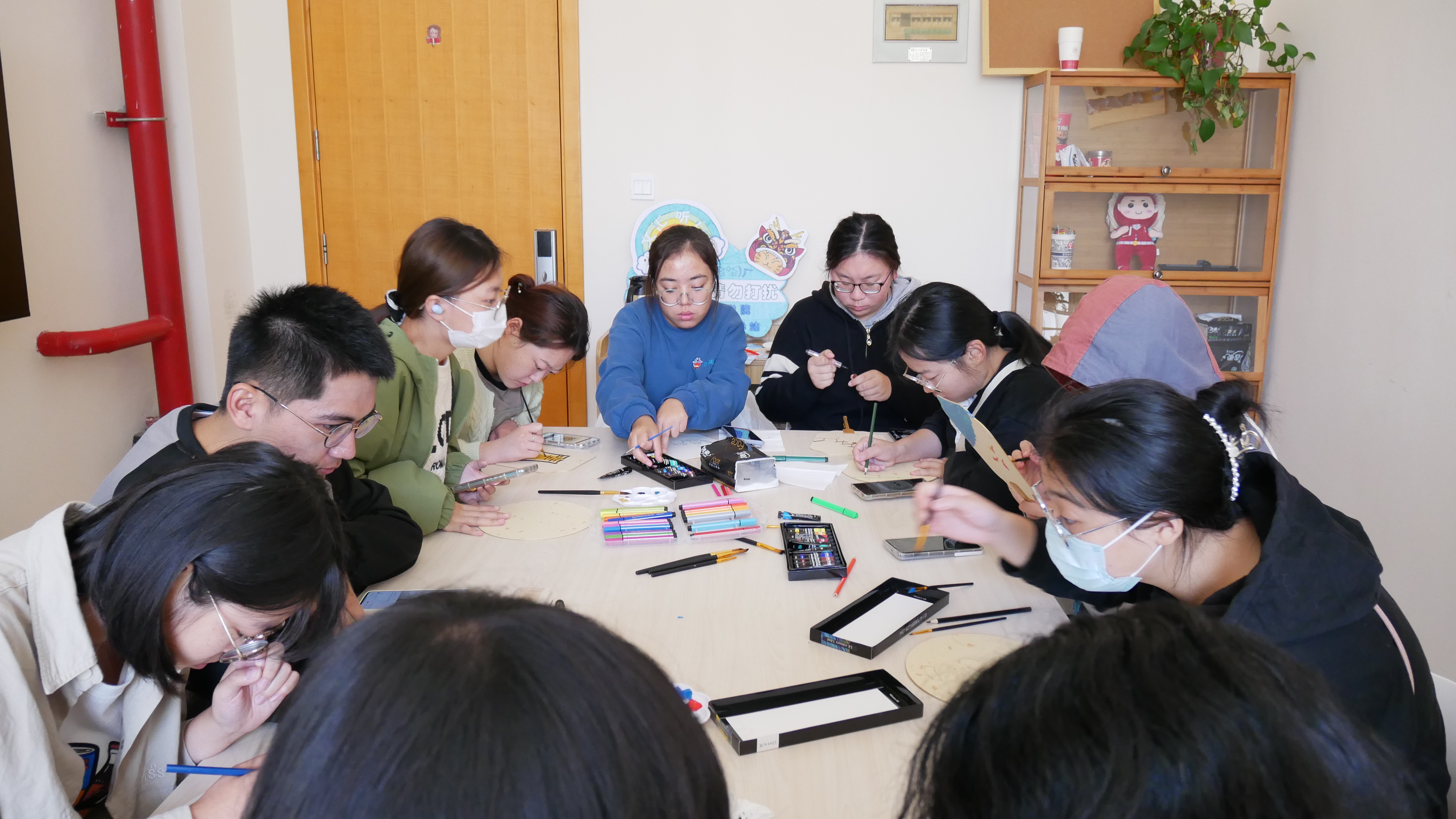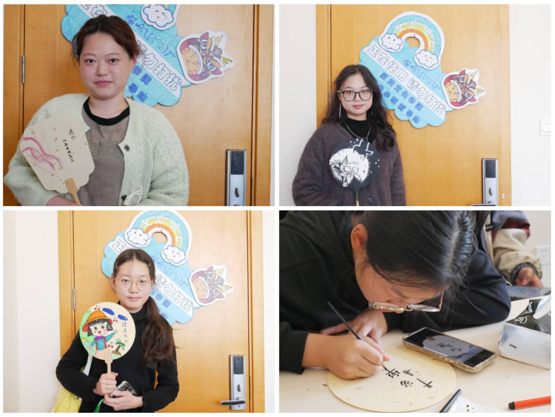 活动现场,辅导站为大家准备了多种空白团扇,颜料和画笔等材料,并向大家细心讲解了手绘团扇注意事项。活动正式开始后,同学们细心作画,交流心得,分享日常生活,整个活动现场弥漫着浓厚的创作热情和欢声笑语。