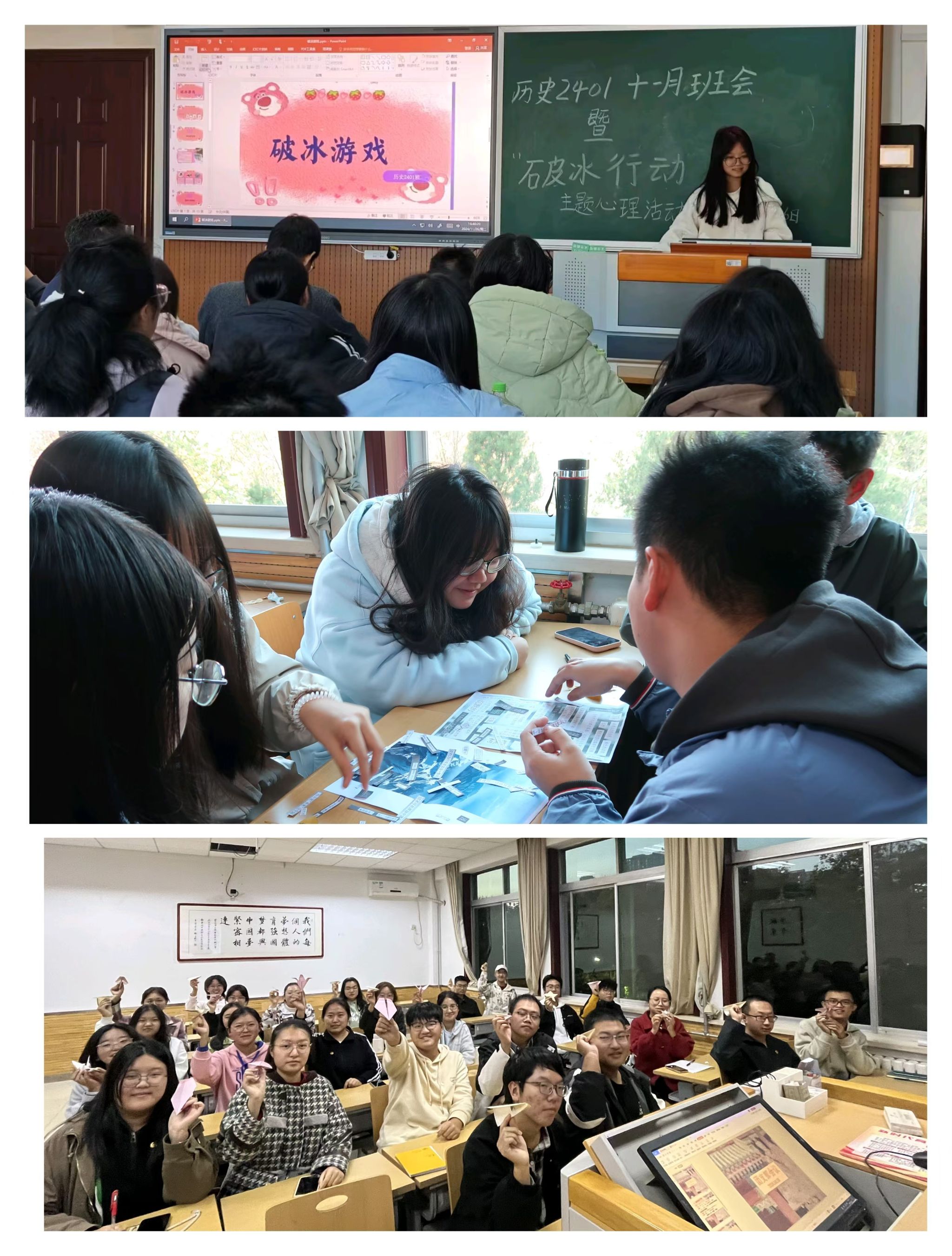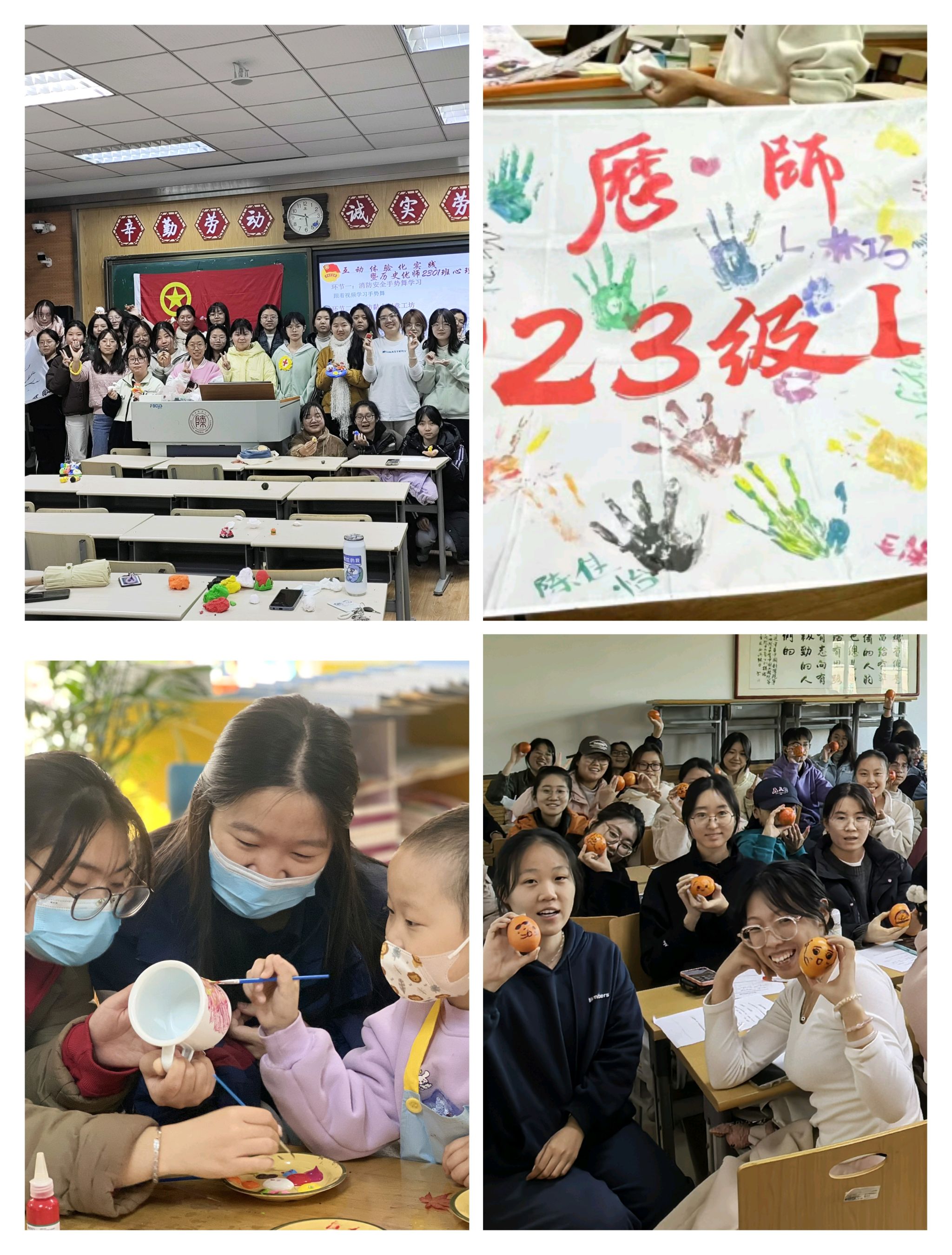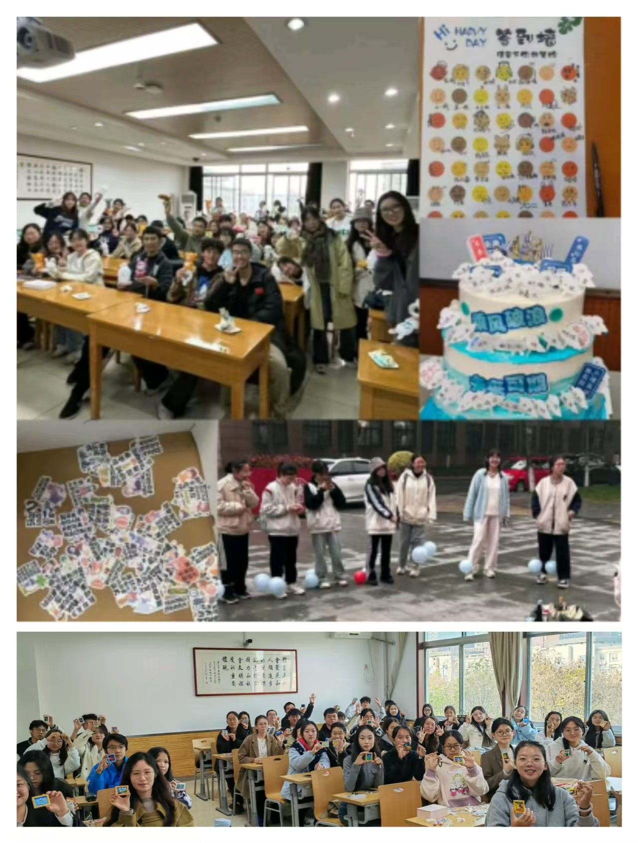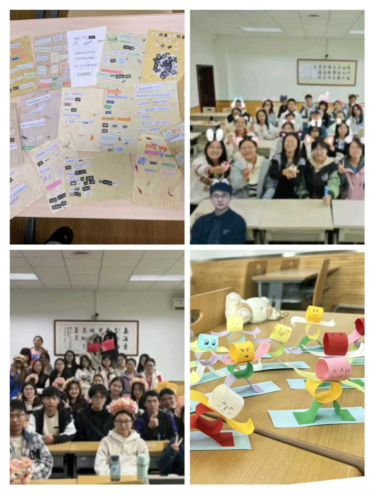 各班级以心相会、温暖同行,精心组织开展了丰富多彩、有益身心的特色活动,培育了积极向上的健康心态。24级同学们开展了数字炸弹、指纹树签到、情绪盲盒、手工制作落叶书签等活动,在互动协作中增强班级凝聚力。23级同学们开展了DIY摇晃小人、纸飞机大赛、绘制班旗、员工林寻宝等活动,感悟自然魅力,拉近心的距离。22级同学们开展了“嘿,可以邀请你给生活拼首诗吗”主题制作拼贴诗活动、簪花剪纸传统文化手工活动、DIY涂抹石膏制作手串活动,在手工制作中缓解心理压力。各班紧扣人际交往、情绪管理、压力释放等心理主题,结合本班专业特色和现实困境,通过创意制作、户外游戏、团体辅导等多种形式,有效引导同学们感受生活、快乐学习。