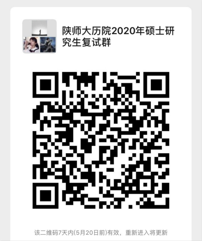 进入复试考生请于即日起至5月15日17:00起扫码进入陕师大历院2020年硕士研究生复试群,以便后续工作有效开展。本群实行实名制,进群后请改名(格式:专业方向-姓名)