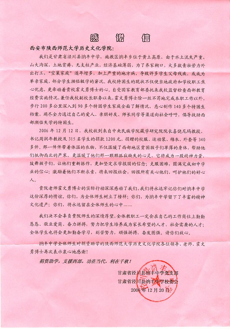 附:甘肃泾川县汭丰中学的感谢信