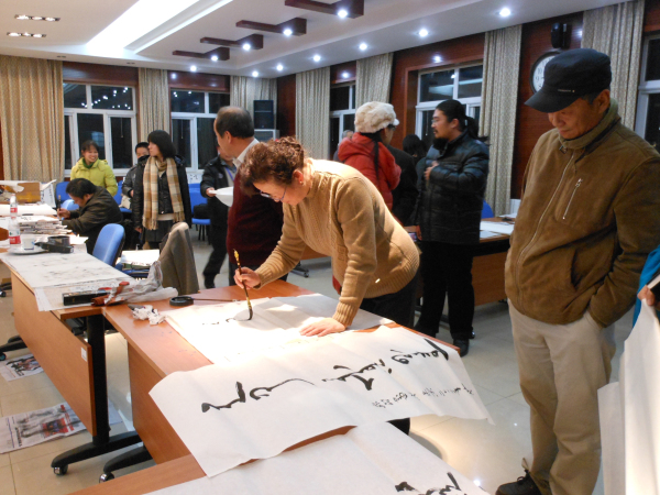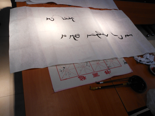 会议期间,会议组委会组织了笔会,会场展有一些少数民族古文字专家的书法作品,並有专家当场作字。刘戈教授也参加了这次笔会,有五幅回鹘文作品在此传阅。