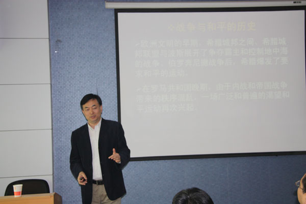 9日上午,刘成副教授作了题为“什么是和平学”的报告。刘成副教授从战争与和平的历史讲起,从伯罗奔尼撒战争讲到9·11事件,提到了人们追求和平的意识的几兴几衰。接着,他谈到了世界的未来和人的责任,将话题转移到了本场讲座的中心—“和平”,进而延伸至和平学。通过对和平学下的定义,以及和平学所应包括的和平理论、和平建设以及和平实践(包括,peacekeeping,peacemaking,peacebuilding)的讲解,深入了对和平学的认识,通过讲述与暴力相关的理论知识,进一步升华了讲座的中心—和平学于世界的重要意义。