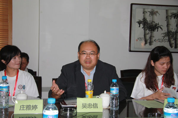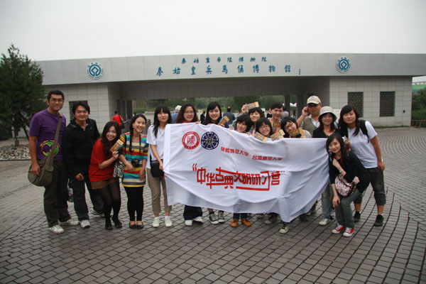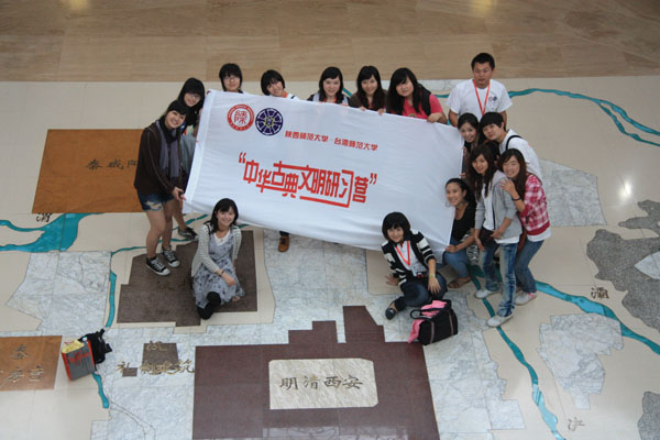 台湾师范大学总务长吴忠信教授、公共关系室行政专员庄雅婷女士、IBO 2011组织委员会秘书赵笠雯女士,陕西省社科联主席、陕西师大best365中国官方网站赵世超教授、陕西师大港澳台办副主任张凌云女士、best365中国官方网站副经理梁志胜副教授、best365中国官方网站分党委书记丁虹女士以及参加本次研习营的两岸师生参加了开营仪式。开营仪式由梁志胜副经理主持。首先,陕西师大港澳台办公室副主任张凌云女士发表了热情洋溢的讲话,对“老朋友”台湾师大师生表示热烈欢迎,并对本次活动的举办表示大力支持。台湾师大总务长吴忠信教授致辞,他说:“两岸的文化和历史是不可分割的,本次活动以十三朝古都西安作为大本营,目的就是为了感受历史风貌、恢复历史记忆,加强两岸的文化交流与历史认同感。”他说自己已经是第八次来古都西安了。陕西师大best365中国官方网站分党委书记丁虹女士与台湾师大总务长吴忠信教授互赠礼品。最后,张凌云副主任代表best365中国官网将本次研习营营旗授予了台湾师范大学公共关系室行政专员庄雅婷女士,宣告了本次研习营正式开营,并合影留念。