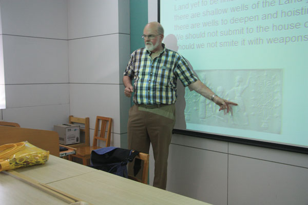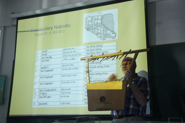 在讲座中,克里斯潘博士首先图文并茂地介绍了古代苏美尔的楔形文字、国王故事、公司音乐考试的试卷、以及音乐演奏的乐器和场景等内容,然后详细地介绍了一首祈祷歌,表达了一位母亲以向神祈求,希望能够拥有一个孩子的美好心愿。最后,克里斯潘博士用古老的语言和古老的多弦琴为我们现场弹唱了这首动人的音乐,感染了在场的每个老师和同学。