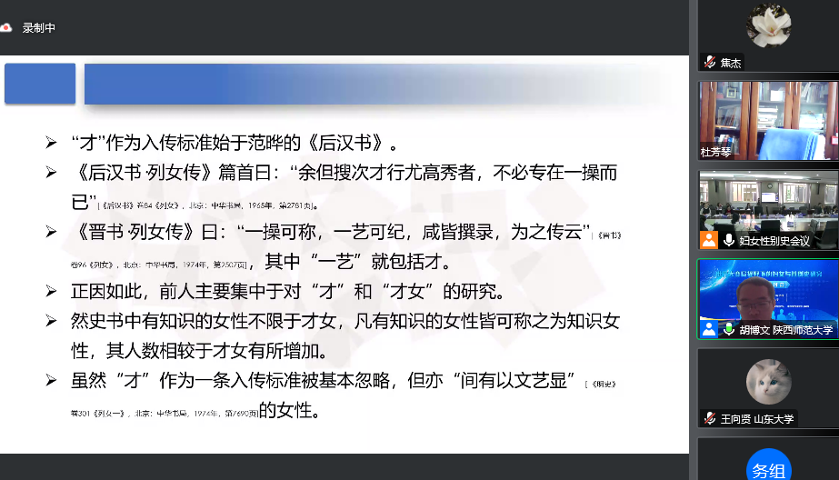 最令人瞩目的是2022级博士生胡博文,他以《从为己到为人:论正史〈列女传〉中知识之于女性功用的嬗变》一文在大会研讨中做了主题发言。该文以正史《列女传》中的才女为研究对象,分别从女性知识的获取渠道、才女身份及家庭出身、才女的表现及行为,来探讨不同时期知识对女性的功能。选题独特、视角新颖,获得众位学者的好评。
