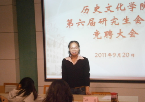竞选大会于晚7点正式开始,研会副主席胡莉宣讲了竞选流程后,大会正式打开了帷幕。首先,胡莉向大家介绍了研会主席团成员,接着由办公室主任孙宛宜宣读本次纳新的评分标准;然后研会主席王春阳同学发言,他首先对于2011级参加纳新的同学表示了热烈的欢迎,并对公司研会的基本概况做了简要介绍,最后他鼓励参加竞聘的同学好好表现,力争展示出最好的自己。接下来,研会把时间留给了前来竞选的各位同学,同学们一一上台做了自我介绍和演讲。前来参加竞选的二十多位同学可谓多才多艺,藏龙卧虎。陈华伟、苏锟、司张浩等等同学的侃侃而谈,展示出他们对于历史专业的浓厚兴趣和自己的看法;朱晋一、韩敏等同学在专业之余还有自己对于体育、艺术等方面的爱好,也让在座同学对于以后公司各项活动更好的展开充满了希望…….竞聘过程中,研会各部部长副部长也都向竞聘同学提出了一些问题,得到了同学们妙语横生的解答。