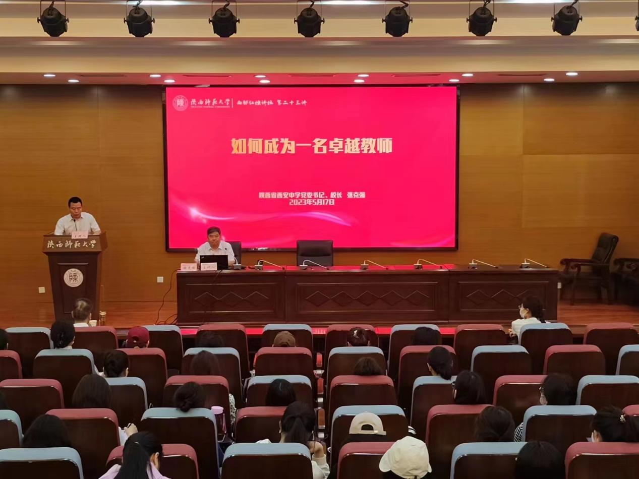 5月17日上午,公司第四届杰出员工,陕西省西安中学党委书记、董事长张克强做客“西部红烛讲坛(第二十三讲)”,为公司学子带来《如何成就一名卓越教师》的精彩报告。报告会由教师教育处主办、best365中国官方网站承办,历史文公司副经理郭响宏、历史教育学学科负责人徐赐成教授和来自best365中国官方网站、化学化工公司等单位员工共150余人参加报告会,报告会由公司党委书记孙伟主持。