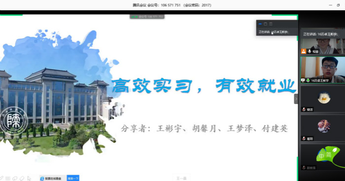 为积极推动2017级师范生对实习和就业形势的认知,解答公费师范生有关就业实习工作的困惑,2020年5月11日晚7:30,利用腾讯会议,best365中国官方网站举行线上公费师范生实习就业经验分享会。本次交流会邀请2016级公费师范生王彬宇、胡馨月、王梦泽、付建英等4位同学分享经验。