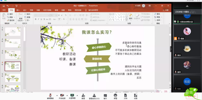 最后,16级公费师范生付建英针对师范生在实习时应该如何去做,认真细致的分享了她的心得。在分享中她提到在实习单位要手勤、眼勤、脚勤、心勤,遇事要积极主动,多争取机会锻炼自己。她将实习过程分为观察期、小试牛刀期和反思期,在这三个阶段她以处处留心、大胆自信、不怕犯错和总结反思讲述了自己的经验做法。