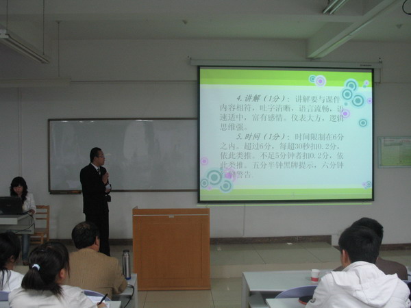 本次比赛于4月9、11、18日共分三场进行,历时两周,共有37个团队参加了比赛。整个比赛于18日晚在文津楼506教室落下了帷幕。参赛同学以省份或地区组队,通过多媒体课件讲解的方式来介绍各地区的经济文化和风土人情,并将介绍教育资源情况、教育人才需求作为重点内容,充分的将专业特色及社会需要相结合。使员工在团结协作的同时加深了对家乡的热爱,在锻炼专业技能的同时开阔了视野,赢得了广大师生的一致欢迎与好评。本次比赛,使同学的课件制作水平、教师讲课技能得到很大提高,团队意识得到了增强。